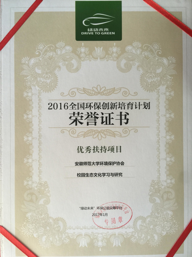 环境保护协会“校园生态文化学习与研究”项目从全国200余项项目中脱颖而出,作为全国23项入选项目之一,荣获2016年全国环保创新培育计划环保公益创新类“优秀扶持项目”表彰。