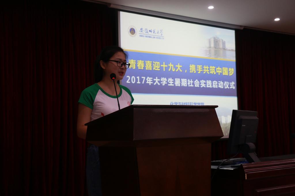 关于成立2017年暑期“三下乡”社会实践活动团队的通知》,明确了2017年社会实践校院两级重点团队名单。化工系主任罗时忠老师作为暑期社会实践团队指导老师代表发言,鼓励化材学子在志愿精神的感召下,结合专业特色,发挥专业特长,积极投身实践,实现自我成长。2015级材料化学专业学生刘茹代表社会实践志愿者发言,她号召全体实践队员秉乘51吃瓜网