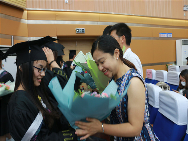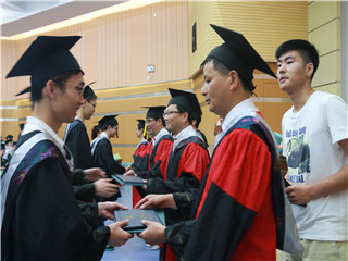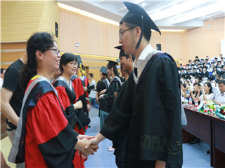 潜岳苍苍,江淮汤汤,夏商肇琪,雍容汉唐。在熟悉的校歌声中,学院院长高峰教授、副院长周双六教授、张小俊教授及各系主任依次为每位毕业生拨正流苏,颁发毕业证书及学位证书。