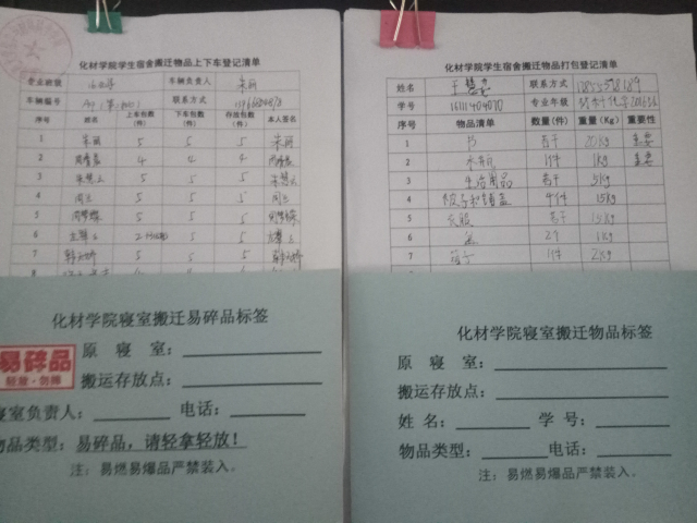 学生宿舍搬迁物品上下车登记清单,在各个搬迁节点,提醒学生清点包裹数目,防止物品遗失。学院注重每一个细节,确保学生的人身、财产安全。