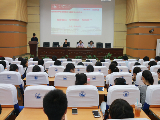 学院高度重视搬迁安全工作,6月23日下午,学院分年级连续举办四场(含研究生)搬迁布置及安全培训会,学院党委书记汪俊武、院长高峰、党委副书记余妍霞、副院长周双六全程参与指导。会上,余妍霞从搬迁要求、打包注意事项等方面对搬迁各项细节问题以PPT的形式进行了全面、细致的说明和要求,让学生进一步明确了搬迁的具体流程和注意事项。汪俊武要求全体同学要顾全大局,服从大局;互帮互助,相互协调;严守纪律,树立形象;注意安全,平安有序。高峰在总结讲话中,鼓励同学们发扬风格,展示化材风采,确保搬迁有序平稳。