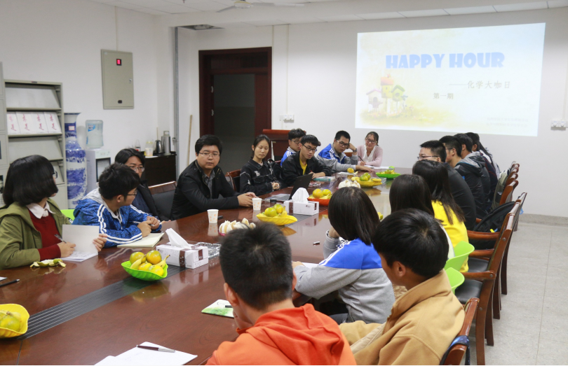 薄明成、吴芯茹)闻师赐教珠玑寥语,胸中渐有丘壑万千。2017年10月23日晚7点化材院在化学楼707室举行happy hour第一期化材大咖。崔鹏老师,张继坦老师和余妍霞副书记受邀与20名化材学子共同参与了此次活动。