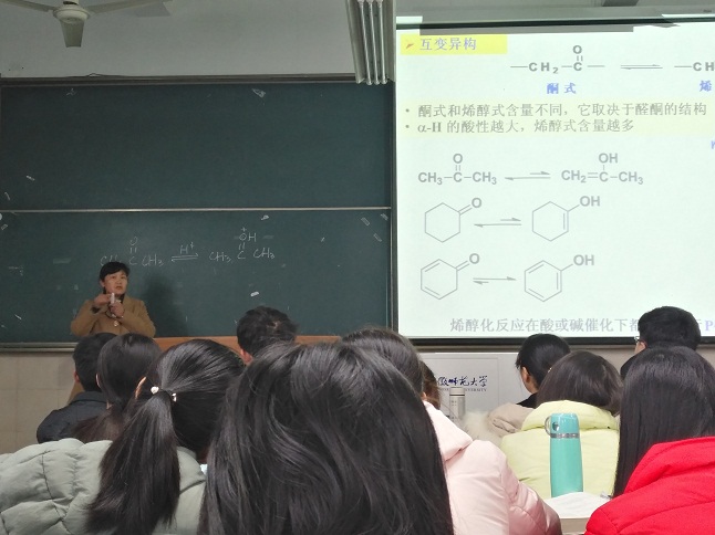 谢美华老师在花津校区行知楼2050201教室为2016级化学(非师范)全体学生讲授了一堂精彩的有机化学公开课,学院副院长周双六、院督导组以及部分教师前来观摩听课。
