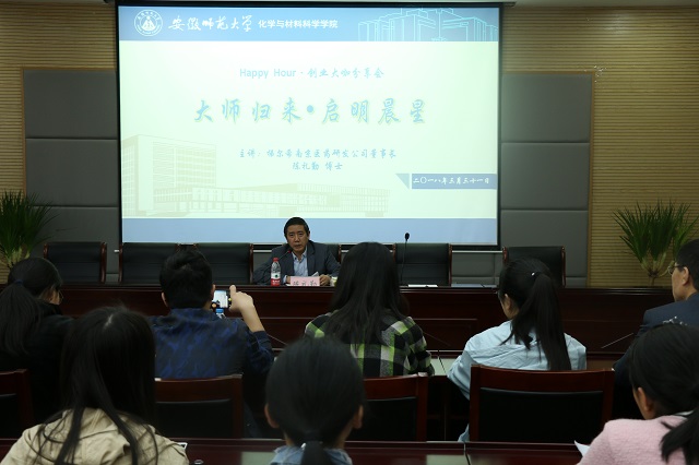 随后,陈博士以幽默风趣的语言向同学们介绍了梯尔希药物公司。他就公司各项国际标准设施规划、高端实验室、行政体系、人才理念、公司环境以及员工福利等方面作了简单介绍,并对师大学子前往就业表示了欢迎。