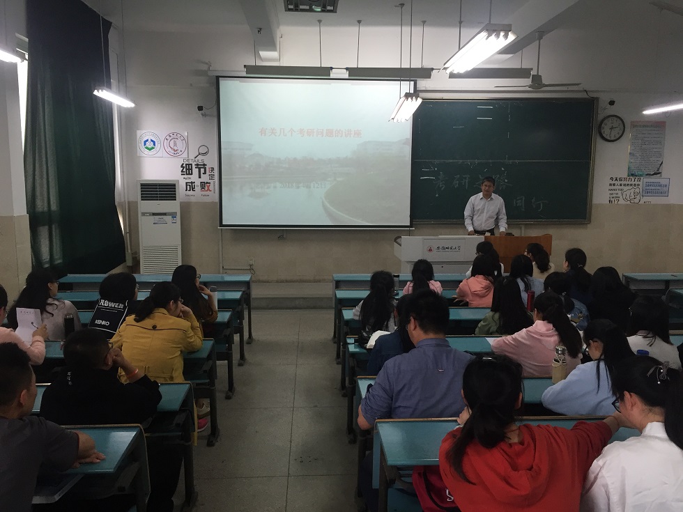 蒋建伟)又是一年考研动员季,4月12日下午,2015级化学(非师范)专业在行知楼1号楼302教室举行了“考研之路,你我同行”考研动员会。研究生学院副院长、学院教授商永嘉老师受邀参加,并给同学们做了考研主题报告。成功考取中国科学技术大学研究生的2014级化学非师范专业李航宇也受邀参加,与同学们分享了考研之路上的宝贵实战经验和心得感悟。动员会由辅导员蒋建伟老师主持。