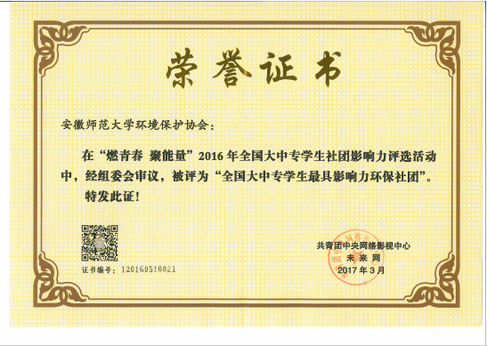 同时,协会也积极主持参与社会各类环保项目。2011年,“保护母亲河—全国青少年生态环保社团小额资助美涂士”项目被评为全国一类环保公益项目;2017年,在“CYCAN高校节能7.0校园低碳”项目中获得了全国第四名,且荣获“能耗调研优秀团队”荣誉(全国十佳优秀调研团队)与“能耗调研绿色青年力量”称号;同年成功结项了“CYCAN‘MyH2O’中国水质地图平台”项目;4月又荣获中国扶贫基金会和中石油公司“益路同行”公益社团年度项目资助资格。协会的工作也得到了国家基金会的支持和肯定,2017年4月,协会作为全国30支社团之一入选了中华环保基金会和中国扶贫基金会首批全国高校环保行动联盟,同时入选其 “GREEN IDOL”校园环保公益挑战赛联合发起方。同年12月,协会对“化”成长——绿色使者环保讲师赴皖南长江流域城市化学环保科普能力定向培养项目获2017年“阿克苏诺贝尔中国大学生社会公益奖”金奖。