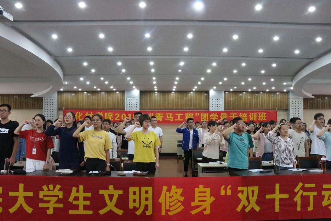 大学生文明修身教育“双十行动”实施方案》,阐述了“双十行动”的主要内容及重点创建区域。来自2016级化学师范专业的王慧同学作为学员代表发言。150名团学骨干在素质拓展部部长黄月带领下慷慨激昂地进行了爱校荣校大学生文明修身“双十行动”宣誓。