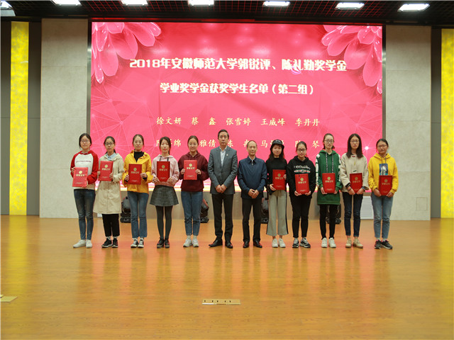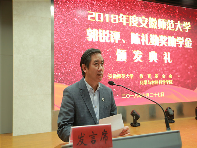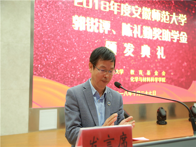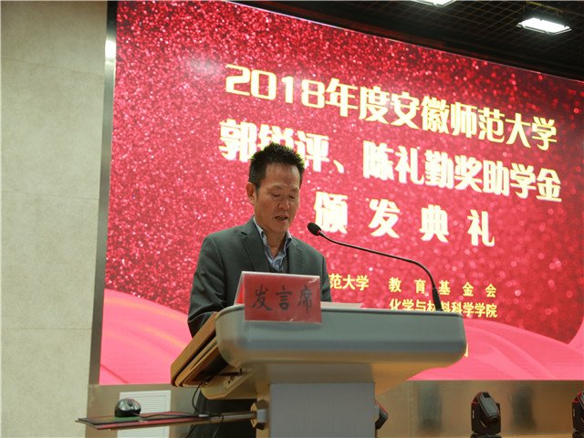 颁发典礼在嘹亮的国歌声中拉开了序幕。校教育基金会项目管理部部长郑金泽宣读了颁发郭锐评、陈礼勤奖助学金的决定。随后,陈礼勤和各位领导分批次向获奖、受助学生颁发奖助学金并合影留念。2016级化学师范专业王慧同学及2017级化工专业吴飞同学分别代表获奖、受助同学发言,两位同学分别表达了对郭锐评女士、陈礼勤博士的无私资助表达了深深的敬意,对学校、学院的关心表达了深深的谢意。两位同学表示郭锐评、陈礼勤奖助学金的设立给不仅给带来了物质上的奖励和帮助,更是精神上的鼓励和支持,郭锐评女士、陈礼勤博士克服重重困难,勇于创业的奋斗精神更是激励广大学子能够更加努力更加拼搏,两位同学都表达了要以更加优异成绩来感谢郭锐评女士、陈礼勤博士及学校学院给予的无私关怀与帮助,以青春之我,奉献青春之国家、青春之民族,也以青春之力为90岁师大添砖加瓦。