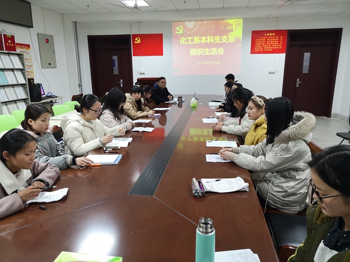 本网讯(化工系本科生党支部 吕潇)3月7日,化工系本科生党支部在理科实训大楼707室召开组织生活会,并开展民主评议党员等工作。支部全体党员参加了会议,会议由党支部书记程紫丹主持。程紫丹强调深入学习习近平新时代中国特色社会主义思想、学习党章党规的重要性。并强调本次组织生活会和民主评议党员,要结合实际情况、聚焦突出问题、抓住要害,深刻的进行批评和自我批评。