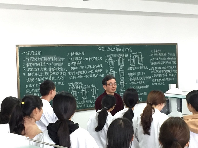 许宏田)2019年3月20日下午,返聘教授熊言林老师在礼勤楼610-611为2016级化学师范生带来了一堂绘声绘色的实验公开课。学院部分领导、老师参与了本次教学观摩。本节课的主题为“原电池的设计与探究”。