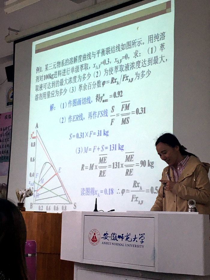 此次化工公开课准备充分,经过精心课程设计,田瑞芬讲授了化工中萃取过程计算这一章节。在正式课程开始前,对上节课所讲液-液相平衡知识点进行了简要回顾,并时刻关注学生们总体对于应掌握知识点的理解情况。在本章讲授过程中,田瑞芬教学思路清晰,善于带动课堂气氛,积极带动学生先进行自主思考并共同推导出核心知识点内容,之后再加以讲解。使用图解法解萃取过程这一知识点步骤繁多,田瑞芬有选择性地重新讲述了之前章节的核心知识点,并让同学们在课堂上自己动手操作绘图连线求解以获得最为完善的教学成果。注重了课程的循序渐进与新内容和先前知识的连贯性。