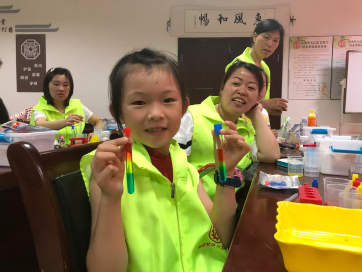 志愿科普团队队员协助参与的孩子做实验)