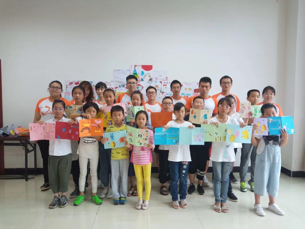 “小小字母C,大大数字1,两只耳朵小尾巴,摇摇摆摆真可爱…… ”跟随于卡通画教学视频和志愿者老师的逐步讲解,这些毫不起眼的元素组合变换绘成了孩子笔尖流转而出的独角兽。翻折剪裁将色染,勾绘贴饰把诗填。“荷花蜻蛉卡”“疏影梅花卡”“独角兽王卡”……在志愿者的协助下,一张张别出心裁的贺卡缓缓呈现。
