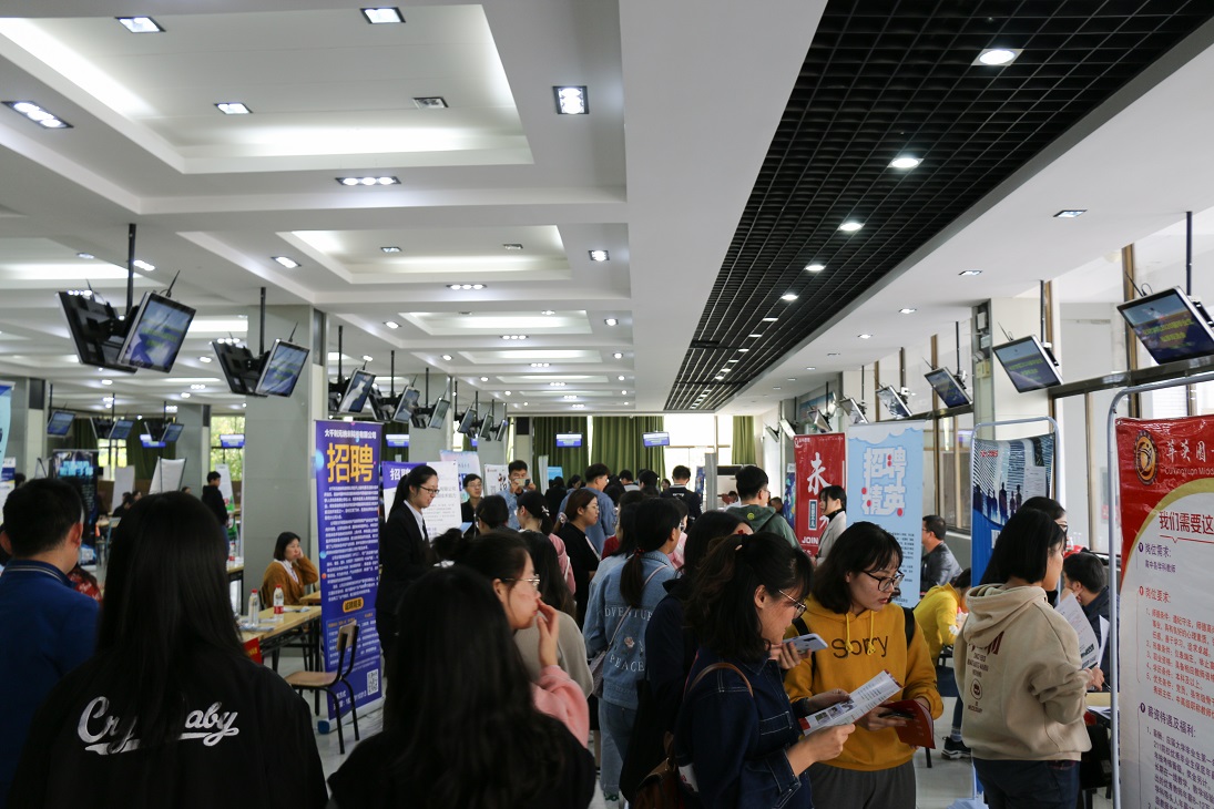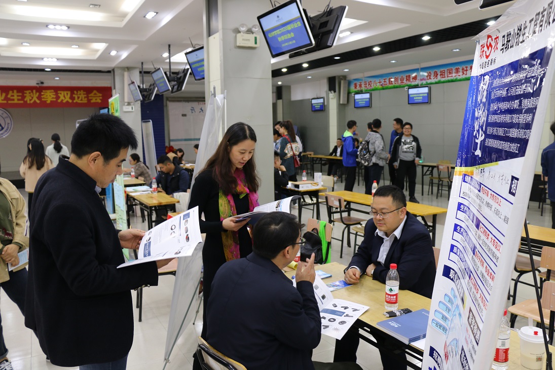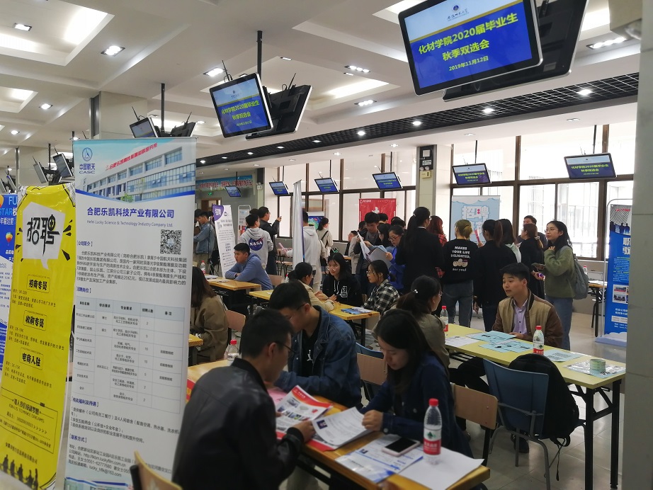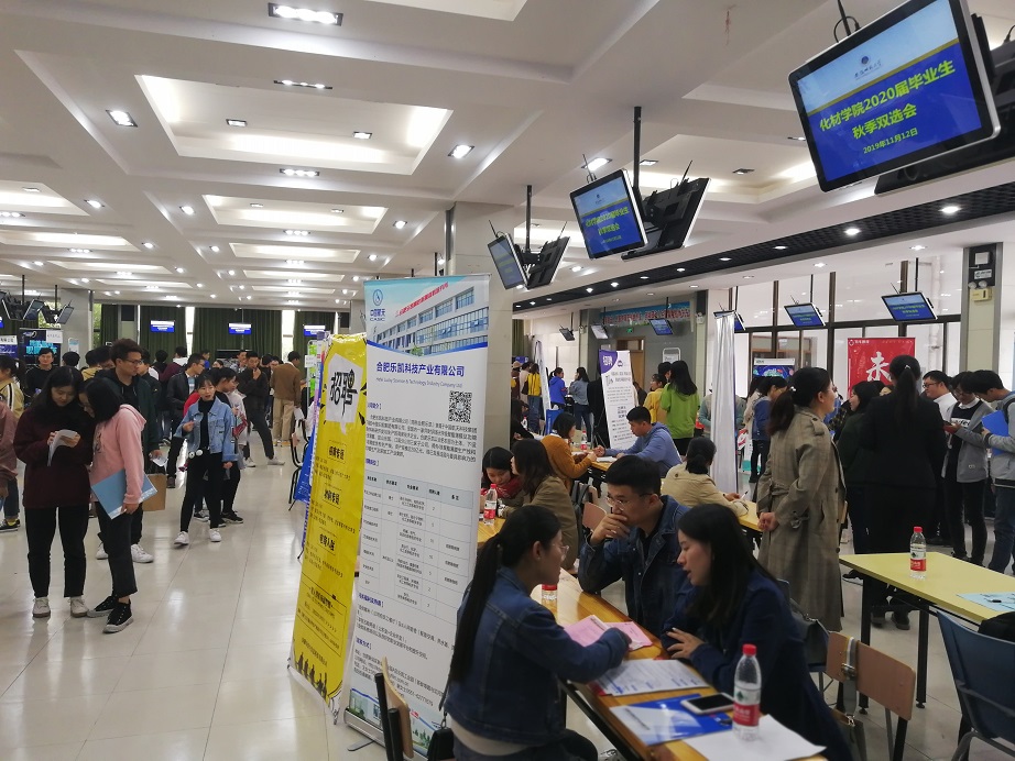 2020届毕业生秋季校园双选会在大学生活动中心二楼招聘大厅举行。参加双选会的46家用人单位提供生物医药、化学化工、材料科学、教育教学和综合岗位类等700余个招聘岗位。合肥新站高新区人社局作为学院毕业生就业合作单位,组团带领多家家企业参加双选会。