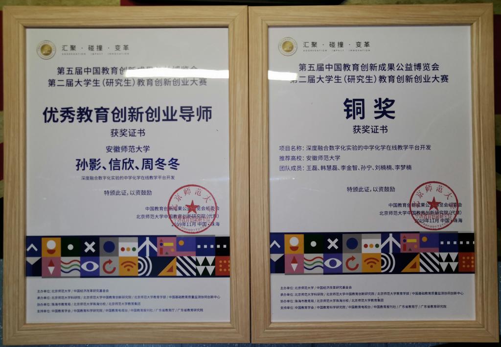 孙宁 韩慧磊)11月20-23日,我院2017级化学师范专业王磊团队的国家级大学生创新创业项目“深度融合数字化实验的中学化学在线教学平台开发”,获邀参加第五届中国教育创新成果公益博览会同期活动第二届大学生(研究生)教育创新创业大赛现场复赛,并斩获铜奖。