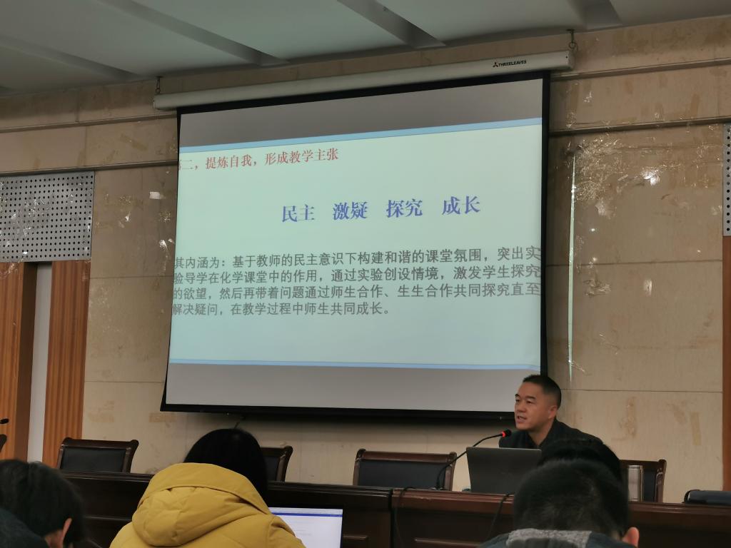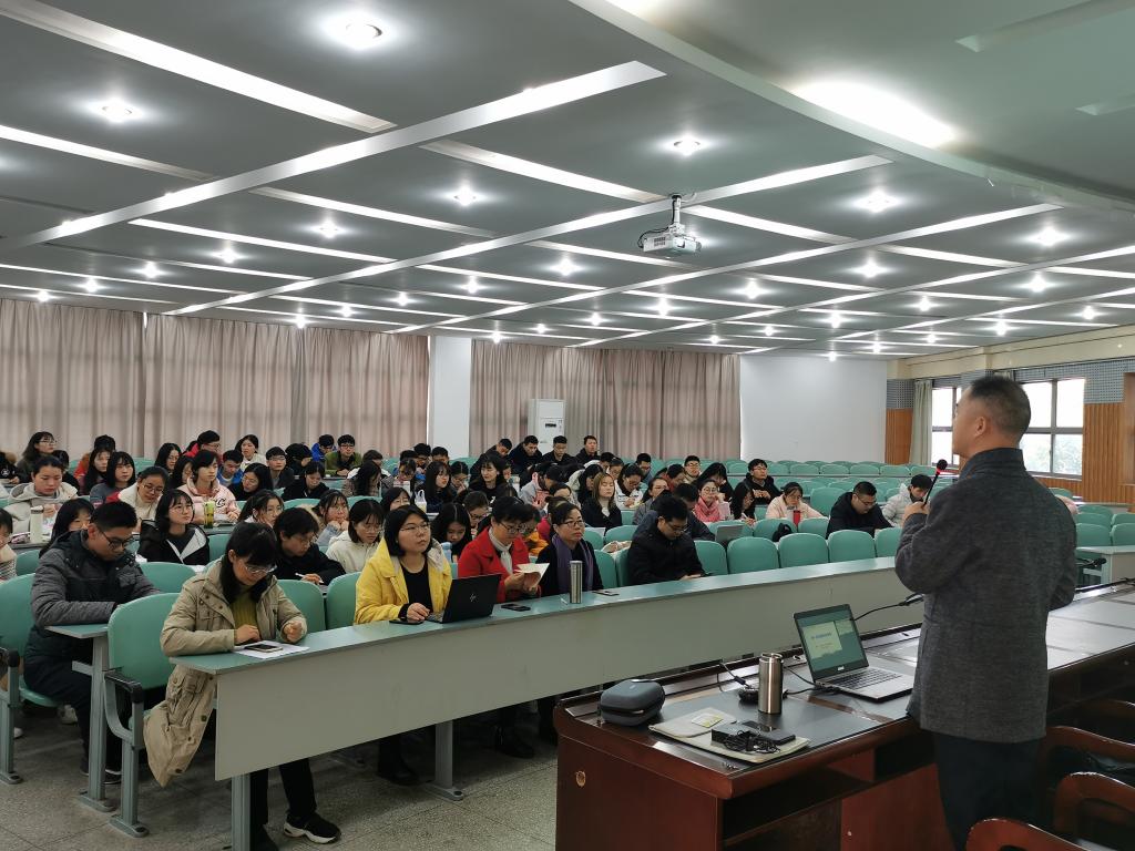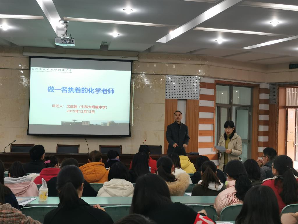 毕桂月)2019年12月13日上午于花津校区财务处二楼报告厅,我院1995级校友、中科大附属中学教研组长、全国高中化学教学改革先进个人戈益超老师为17级化学师范班全体同学带来了一场《做一名执着的化学老师》专题报告,学院化学系系主任阚显文老师主持,学院部分师生参与此次报告。