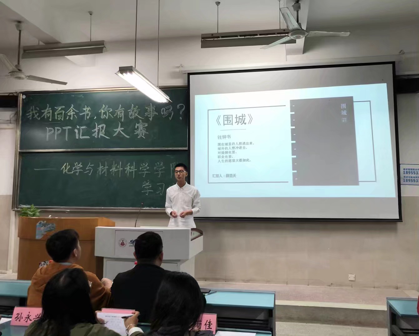 5月8日晚,学院在行知楼2030203首先举行了“我有百余书,你有故事吗”PPT汇报大赛,比赛以PPT汇报的形式展开,比赛中,参赛选手向现场的评委观众推送了自己喜爱的书籍,有耳熟能详的经典小说《围城》,有记录三毛青春岁月的《雨季不再来》,有文字唯美、意境清远、情感深沉的《青铜葵花》,参赛选手以个人情感体验与作品结合的方式,以现场朗读的形式为观众带来了一段段精彩的读书分享。