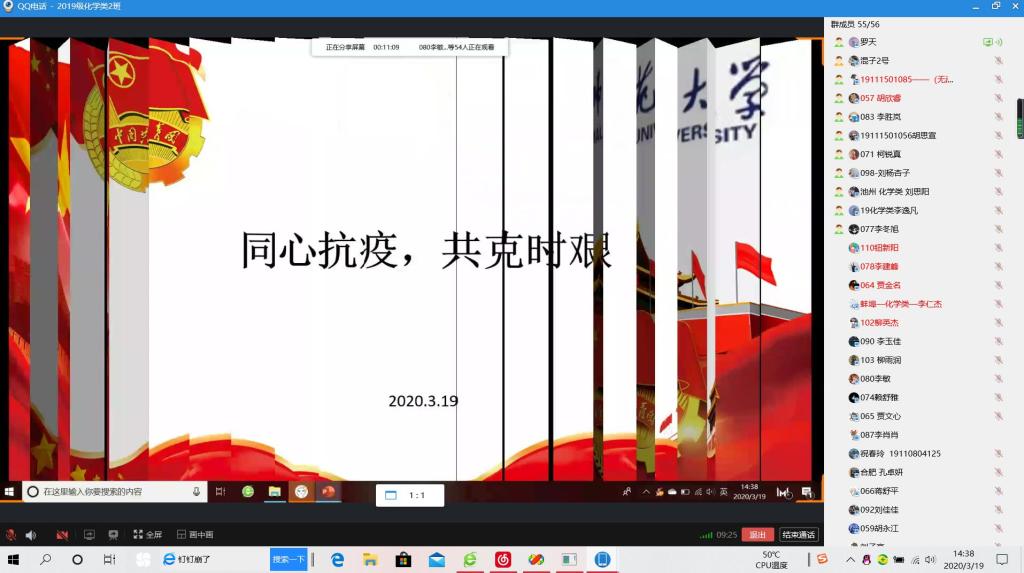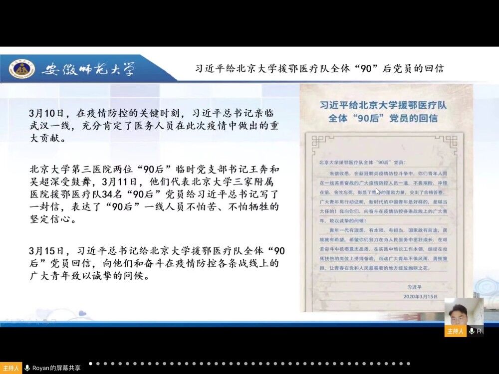 学院团委充分发挥战斗堡垒作用,号召学生党员、骨干、入党积极分子发挥先锋模范作用,鼓励同学们参加思政课、战疫团课等线上学习,贡献自己的青春力量,将德育潜移默化于引领学习、鼓励行动、宣传做法的日常工作中来。3月中旬,学院团委组织各年级团支部开展“学习习近平总书记给北京大学援鄂医疗队全体90后党员的一封信”主题微团课。此次微团课实行线上直播形式,由各年级团支书和辅导员带领同学们仔细研读了习近平总书记给援鄂医疗队全体90后的回信,并认真学习了90后医生和青年志愿者的抗疫事迹,广大团员青年通过各类线上平台积极参与讨论,以抗疫先进人物为榜样,不断提高思想觉悟,以身作则,身体力行,彰显了团支部的战斗堡垒作用。