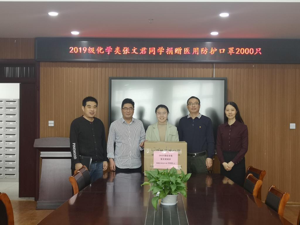 化学与材料科学学院2019级化学类专业张文君同学捐赠2000只医用防护口罩(定向化材学院)仪式举行,因校园疫情防控需要,此次捐赠由该生所在班级辅导员陈静老师代为进行,学院领导班子成员现场见证捐赠。