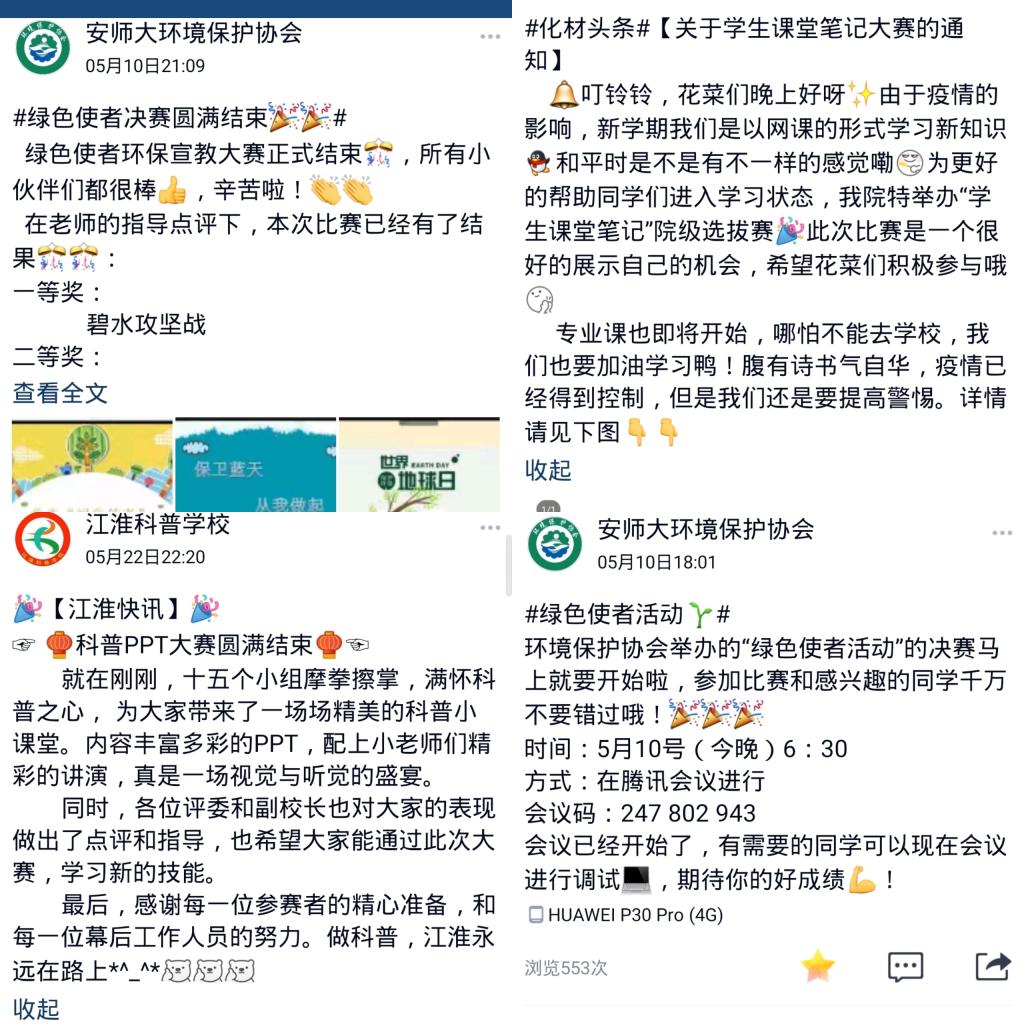 江淮科普学校携手学院组织了面向全院学生的“少年新风貌,江淮科普行”社会性科普活动,参赛者通过QQ、钉钉、腾讯会议等平台完成线上宣讲。这次活动采用小组的形式,充分发挥小组共享和交流合作的优势,引导更多学生加入到公益事业当中。