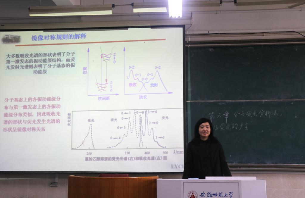 课程开始,刘云春老师通过精彩的教学导读介绍了本章的学习内容,用精心制作的能级图为同学们详细解释了分子发光的原因。随后,刘云春老师借助生活中的实例:萤火虫发光、晚会活动用的荧光棒等,引入了本次课程的主要内容分子发光分析法—荧光分析法,并结合课本内容讲述自身童年趣味故事,以此教导同学们辨别荧光分析法和磷光分析法中荧光与磷光产生速度的不同。除此之外,刘云春老师重点讲授了荧光光谱与激发光谱的特点,利用曲线图为同学们呈现了激发光谱和荧光光谱几乎对称的图像,并讲解了斯托克斯位移的具体原因。接下来,为了让大家充分理解并掌握荧光分析法的相关内容,刘云春老师通过生动活泼的语言向同学们介绍了荧光光谱仪,并回顾以往课堂内容,与学生共同思考疑难知识点,目的是为了让学生能够熟练掌握课程内容。