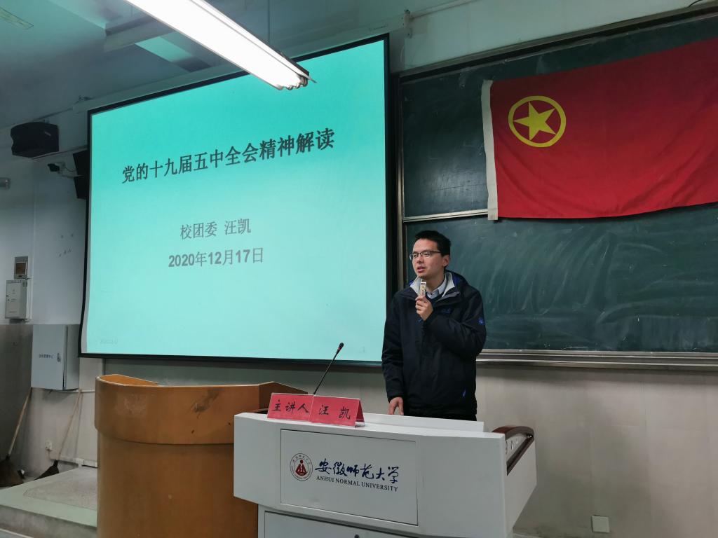 团学骨干青马工程培训班集中学习十九届五中全会精神。本次培训由校团委书记汪凯主讲。