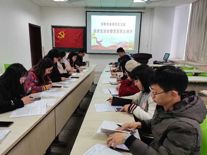 无机专业研究生党支部在礼勤楼1038教室开展组织生活会并进行党员民主评议,学院党委书记汪俊武出席会议并进行指导,会议由支部书记杨琨主持。