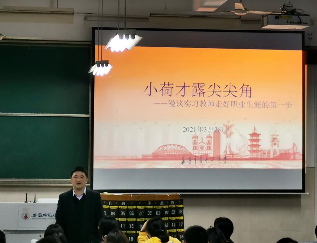 严增进老师围绕“融合核心素养的高中化学新教材”对高中化学新教材(必修)进行了详细的解析,通过新教材中“元素及其化合物”与“基本概念和原理”穿插编排的结构特点的讲解,可以看出新版教材对老版教材的继承、发展和创新,即分散了学习难度又符合学习规律,他希望2018级化学专业师范生要尽快熟悉新教材。陈波老师围绕“小荷才露尖尖角——漫谈实习教师走好职业生涯的第一步”主题,从教育实习的目的和功能入手,强调了教育实习的必要性。他指出在教育实习中应及时做好身份转换与角色变化,尽快熟悉实习学校的作息时间与管理规定,融入实习班级。最后,陈波老师用“坚定的职业向往、匹配的个性气质、扎实的专业基础、敏锐的洞察能力、高超的沟通技巧”总结了教师的特征,期待学生的完美蜕变。两位老师的报告从一线教学实际出发,内容充实,语言生动幽默,为即将到来的教育实习指明了方向。