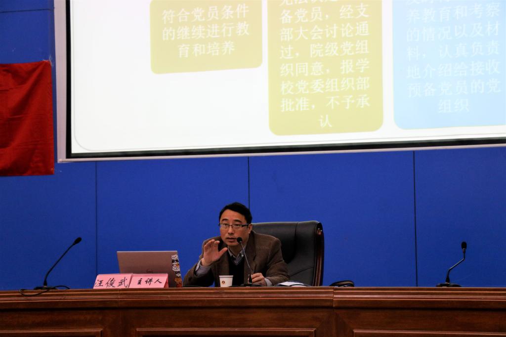 开班仪式后,学院党委书记、分党校校长汪俊武为全体学员作“组织入党和思想入党”专题报告。汪俊武以组织入党和思想入党为纲,深入浅出地介绍了申请入党条件,入党积极分子、预备党员和发展党员的四个阶段,为学员们详细地介绍了思想入党的重要意义、基本要求和基本途径,并多次举出身边的例子帮助大家进一步理解。汪书记以生动有趣的授课方式,使学员们对组织入党和思想入党有了更加深刻的理解,真正做到能在组织上入党,更能在思想上入党,听党的话,与党同心同德,开创有意义、幸福、美好的人生。