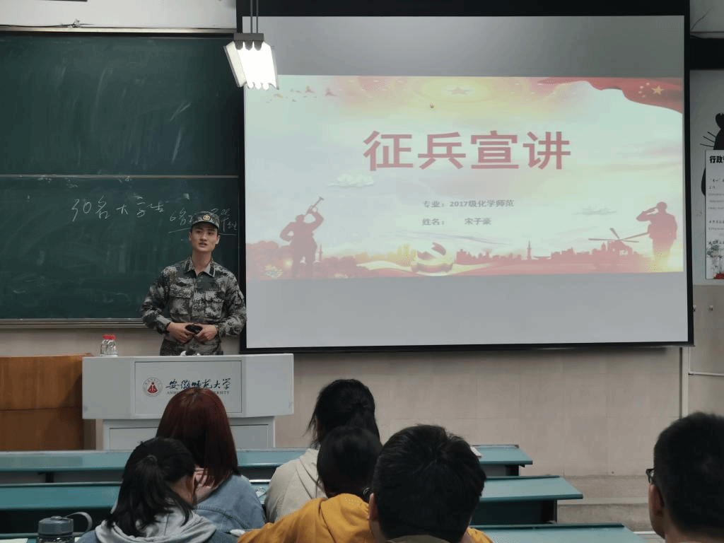 2017级化学(师范)专业退役士兵宋子豪。企业招聘宣讲邀请了安徽美佳新材料股份有限公司、安徽艾密克电联科技有限责任公司、安徽圣奥化学科技有限公司、安徽神剑新材料股份有限公司、安徽东华通源生态科技有限公司等五家公司。