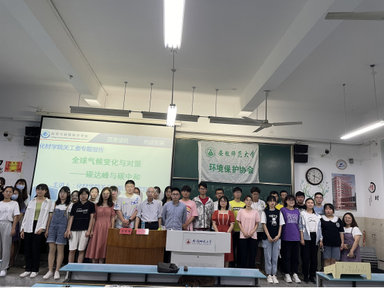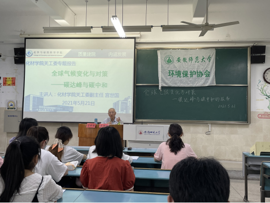 邀请退休党员、关工委副主任、环境保护协会首任指导老师宫世国,为环协师生作了题为《全球气候变化与对策——碳达峰与碳中和》的专题报告。