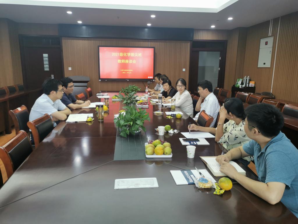 在702会议室召开了2021级化学拔尖班第一学期任课教师座谈会。学院高峰院长、方臻副院长、大学语文何振老师、高等数学朱敏老师、大学英语吴平老师、线性代数黄玉成老师、化学系主任阙荣辉老师、班主任刘云春老师及辅导员张薇老师参加了会议。座谈会由高峰院长主持。