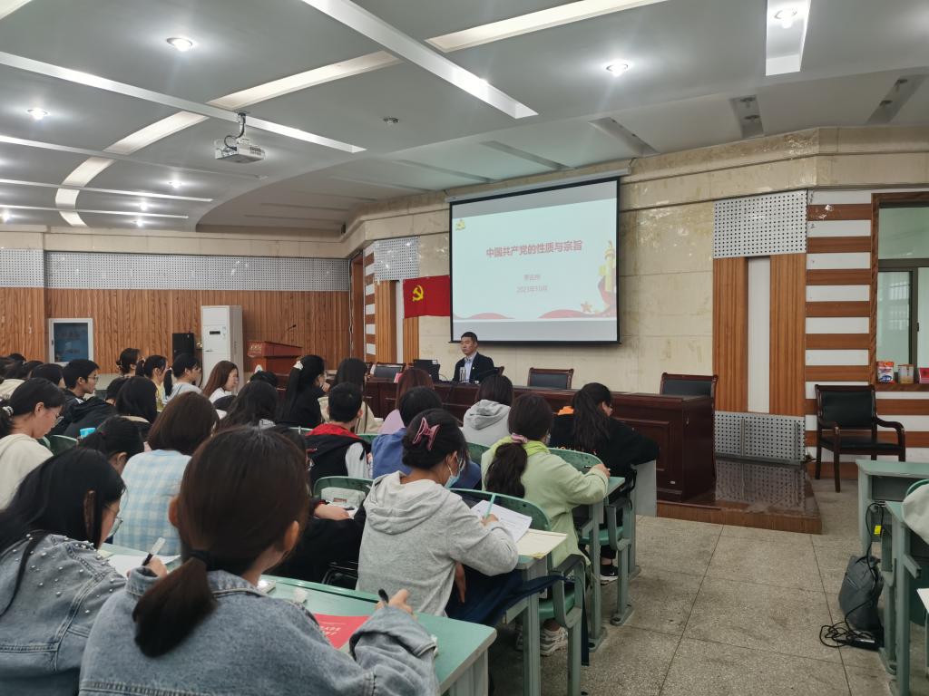 学院党委副书记李古州为全体学员作题为《中国共产党的性质和宗旨》专题报告。报告中,详细为学员们阐释党的性质,中国共产党是中国工人阶级的先锋队,同时也是中国人民和中华民族的先锋队,是中国社会主义事业的领导核心,它始终代表中国先进生产力的发展要求、中国先进文化的前进方向,代表中国最广大人民的根本利益。通过学生身边的典型案例来阐释党的宗旨是全心全意为人民服务,引导学生自觉做远大理想和共同理想的坚定信仰者和忠实实践者。