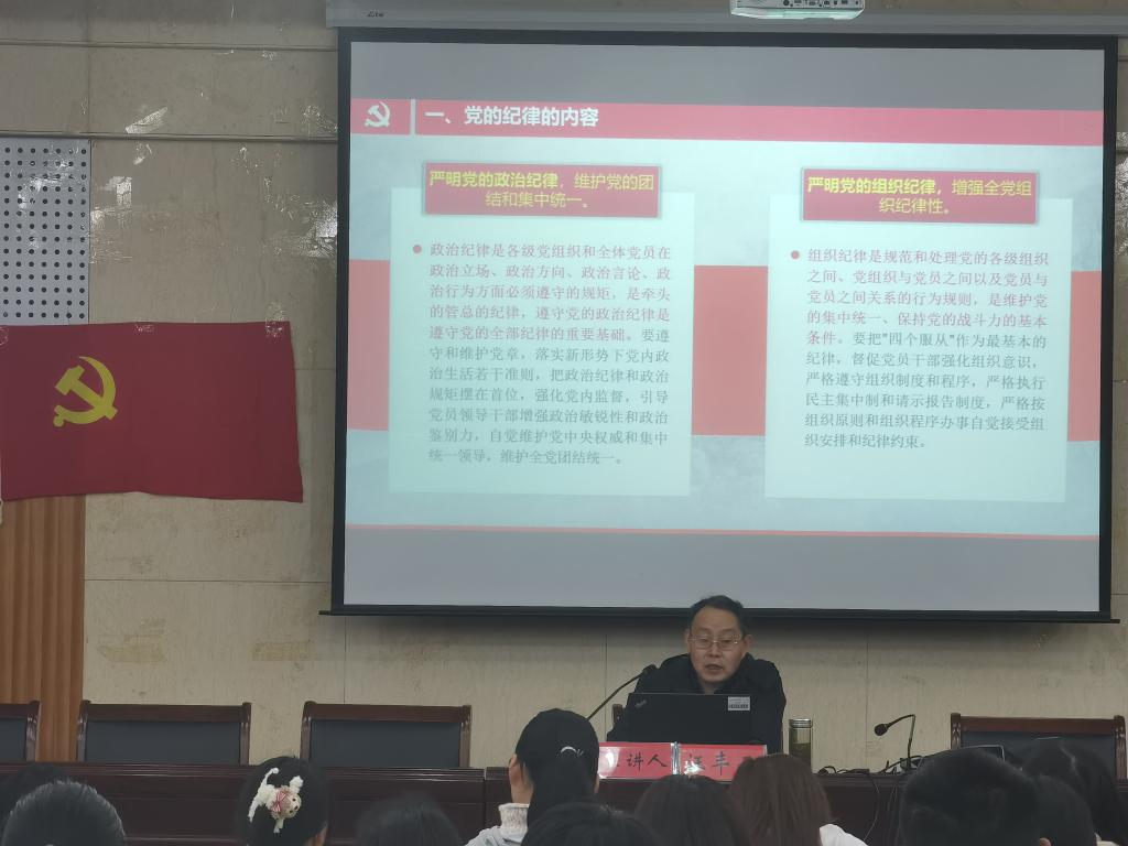 学院专职组织员汪丰云老师带领全体学员学习了中国共产党的纪律。汪老师从中国共产党纪律的发展历程、内涵和特点、重要意义等方面强调了党的纪律是党的各级组织和全体党员必须遵守的行为规则,是维护党的团结统一、完成党的任务的保证。他利用鲜活直观的典型案例,叮嘱学员应从一言一行做起,遵守校规校纪,恪守有关规定,切实培养学员的纪律意识。学员们纷纷表示自己要坚定理想信念,努力做新时代新青年。