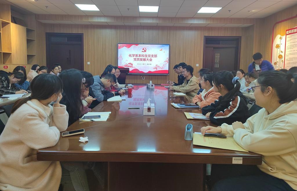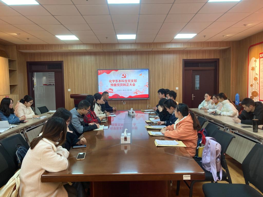 本网讯(化学系本科生党支部 张思雨)11月8日下午,化学系本科生党支部在礼勤楼707室召开了2021年下半年发展党员及党员转正大会。本次大会由化学系本科生党支部书记陈静主持,辅导员程紫丹、王霞及全体党员参加此次会议,51吃瓜网