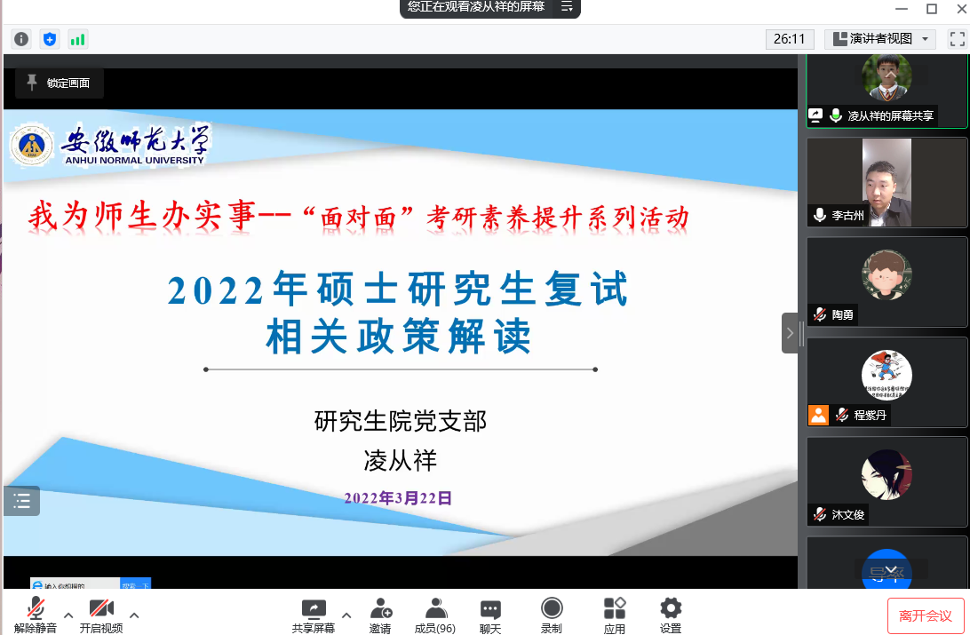 3月23日晚,为切实做好2018级学生考研复试与调剂的指导服务工作,学院利用腾讯会议在线上举行了2018级考研复试与调剂指导会,院长高峰、副院长周双六、校研究生招生办主任凌从祥、毕业班辅导员程紫丹、陶勇以及2018级考研通过国家线的学生参加本次会议,会议由院党委副书记李古州主持。
