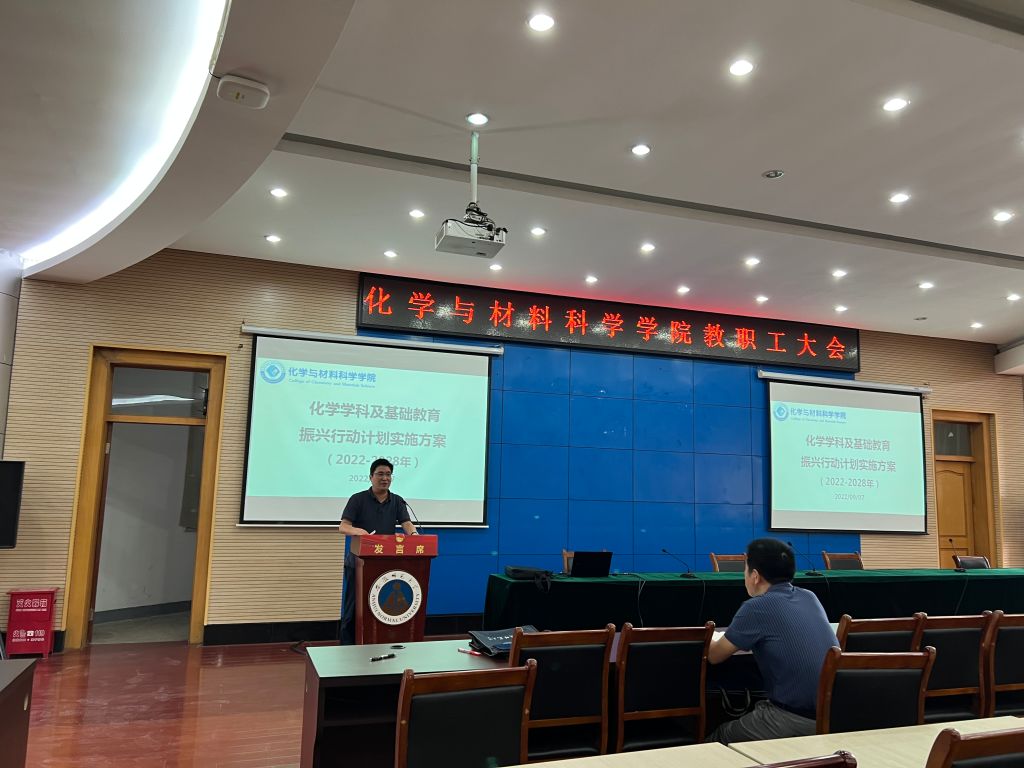 高峰从学科方向整合行动、学科队伍提升行动、科研水平攀登行动、人才培养提质行动和体制机制创新行动等5个方面详细解读了化学学科及基础教育振兴行动计划实施方案(2022-2028年)。他指出,学院全体教职工要讲政治,要提高政治站位,统一思想、统一行动,以高度的责任感和使命感为学院两大振兴行动计划的实施贡献力量;要守底线,要坚守党规党纪、公德和师德,以德立身、以德立学、以德施教;要重情怀,要涵养深厚的教育情怀,珍惜荣誉,凝心聚力,攻坚克难,促进学院高质量发展,以优异的成绩向党的二十大献礼。