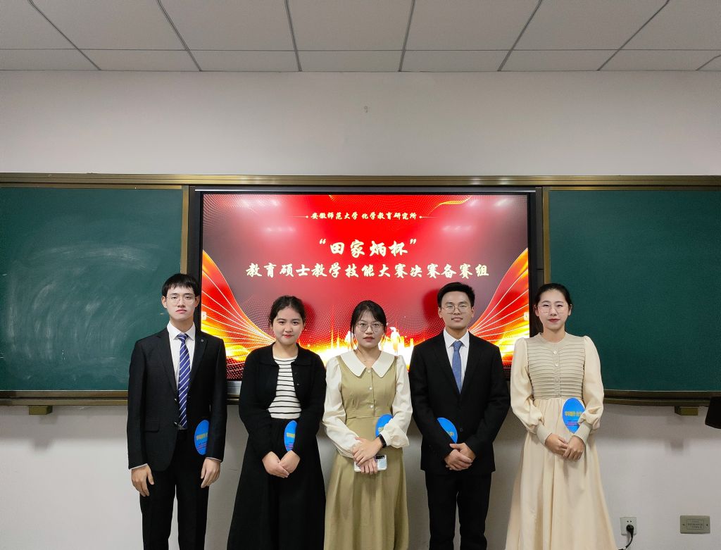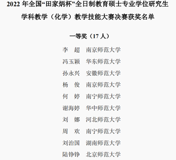 孙永兴、张薇)2022年11月20日,全国“田家炳杯”全日制教育硕士专业学位研究生学科教学(化学)教学技能大赛决赛暨闭幕式在南京师范大学举办,来自全国76所师范院校共347名选手参加了初赛,经大赛组委会评审,共173名选手进入决赛。决赛中,我院五位选手表现突出,在24小时内完成了教学设计、教学视频与说课视频的录制,最终勇夺佳绩。2021级学科教学(化学)专业研究生孙永兴荣获大赛一等奖,刘凤霞、戴银江荣获大赛二等奖,冯警玉、马梁红分别荣获大赛三等奖和优秀教学设计奖。