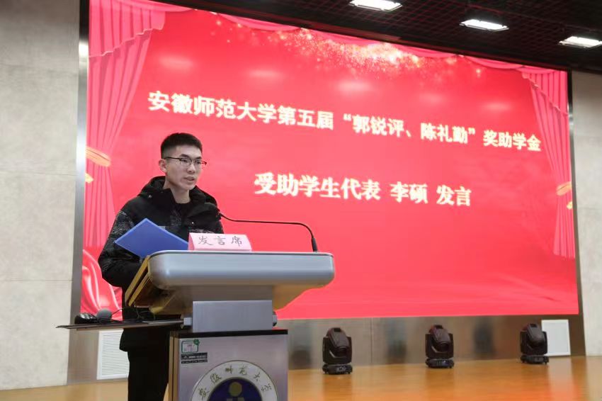 2019级化学(师范)专业戴玢玢和2020级应用化学专业李硕分别代表获奖、受助同学发言,两位同学对郭锐评女士、陈礼勤博士的无私资助表达了诚挚的敬意,并向学校、学院老师和同学们的关心表达了感谢。两位同学表示将怀揣感恩之心,将这份荣誉化为不竭的动力,以更加优异的成绩来回报郭锐评女士、陈礼勤博士及学校学院给予的关心和帮助,并努力将这份大爱精神传承下去,积极投身于社会建设,以梦为马,不负韶华。