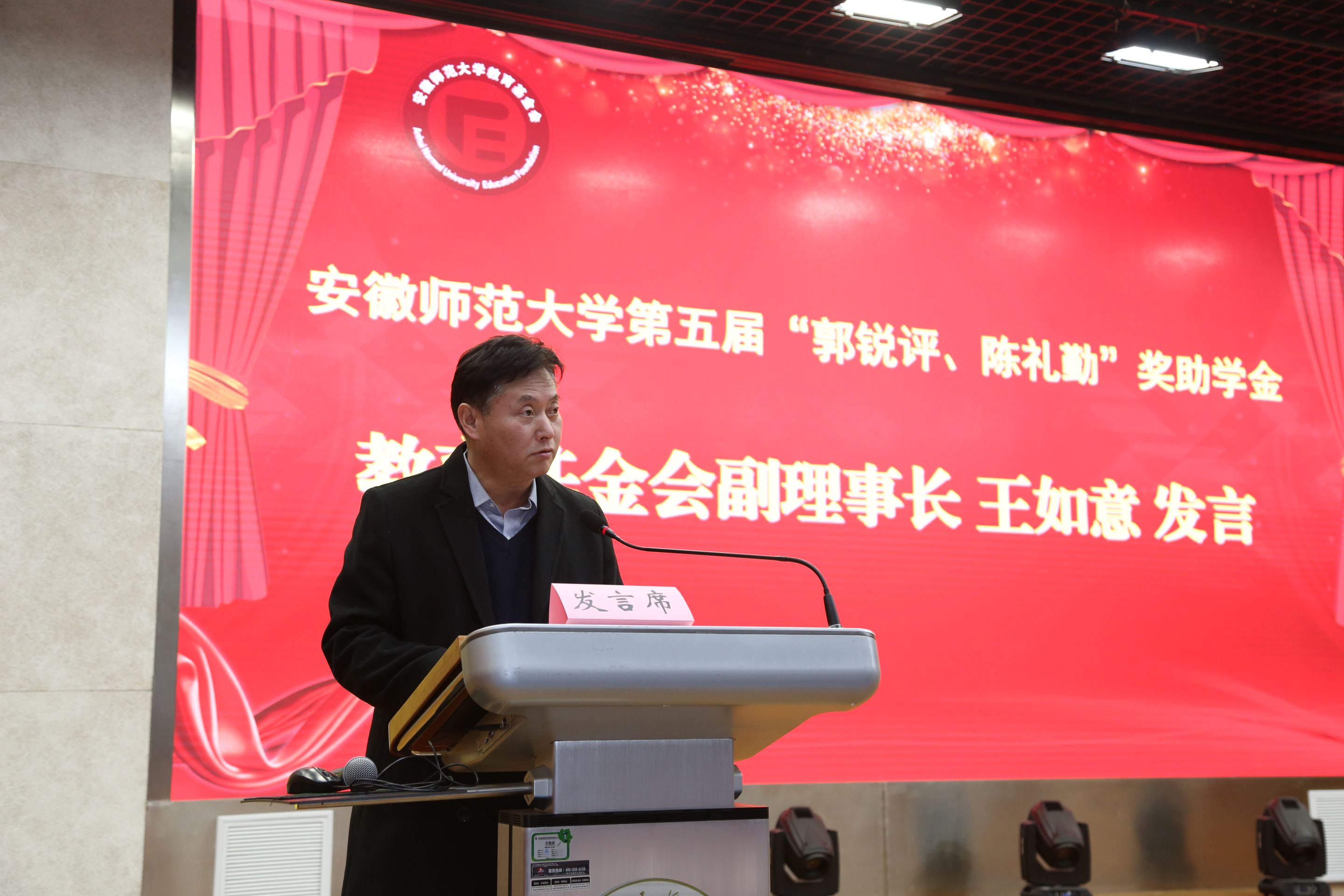 王如意老师代表学校教育基金会向梯尔希(南京)药物研发有限公司芮彬云先生一行表示热烈欢迎,向获奖、受助的同学表示热烈的祝贺。他指出,“校友是母校靓丽的名片”,母校的建设与发展得到了校友们的广泛关注,得益于校友们的大力支持。他寄语广大青年学生:要不负青春,做一位有志气的新时代青年,志存高远、胸怀天下,厚植家国情怀,树立为祖国和人民永久奋斗、赤诚奉献的远大理想,立志做有理想、敢担当、能吃苦、肯奋斗的新时代好青年。要不负韶华,做一位有骨气的新时代青年,始终保持热爱学习、勤于奋斗的本色,主动适应学校培养一流人才的目标和要求,积极为学校“两大振兴行动计划”增添力量。要不负时代,做一位有底气的新时代青年,对未来早作规划、设立目标,重视课内外实践训练,关注学科前沿和未来发展,做到融会贯通、厚积薄发,让青春在党和人民需要的地方绽放绚丽之花。
