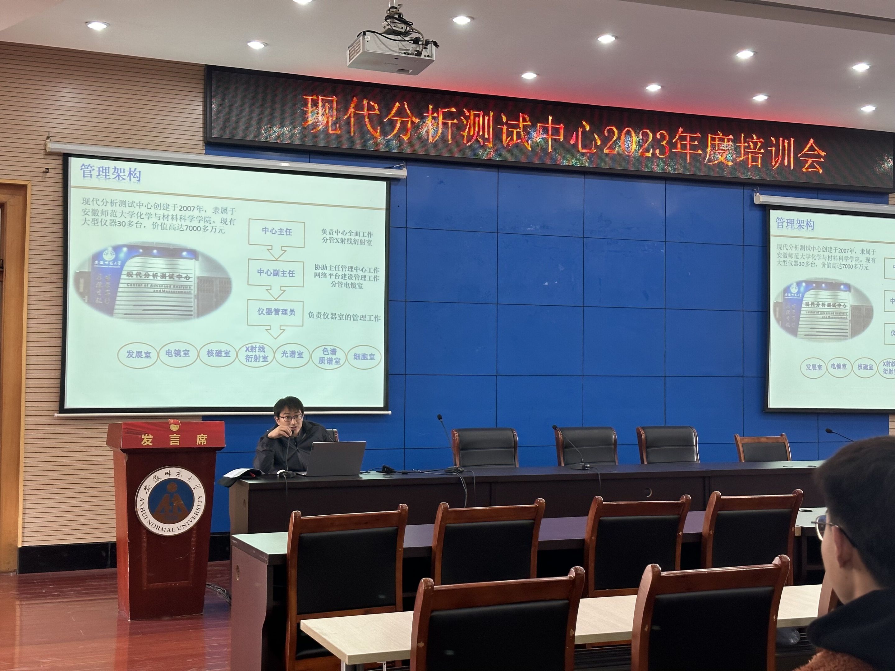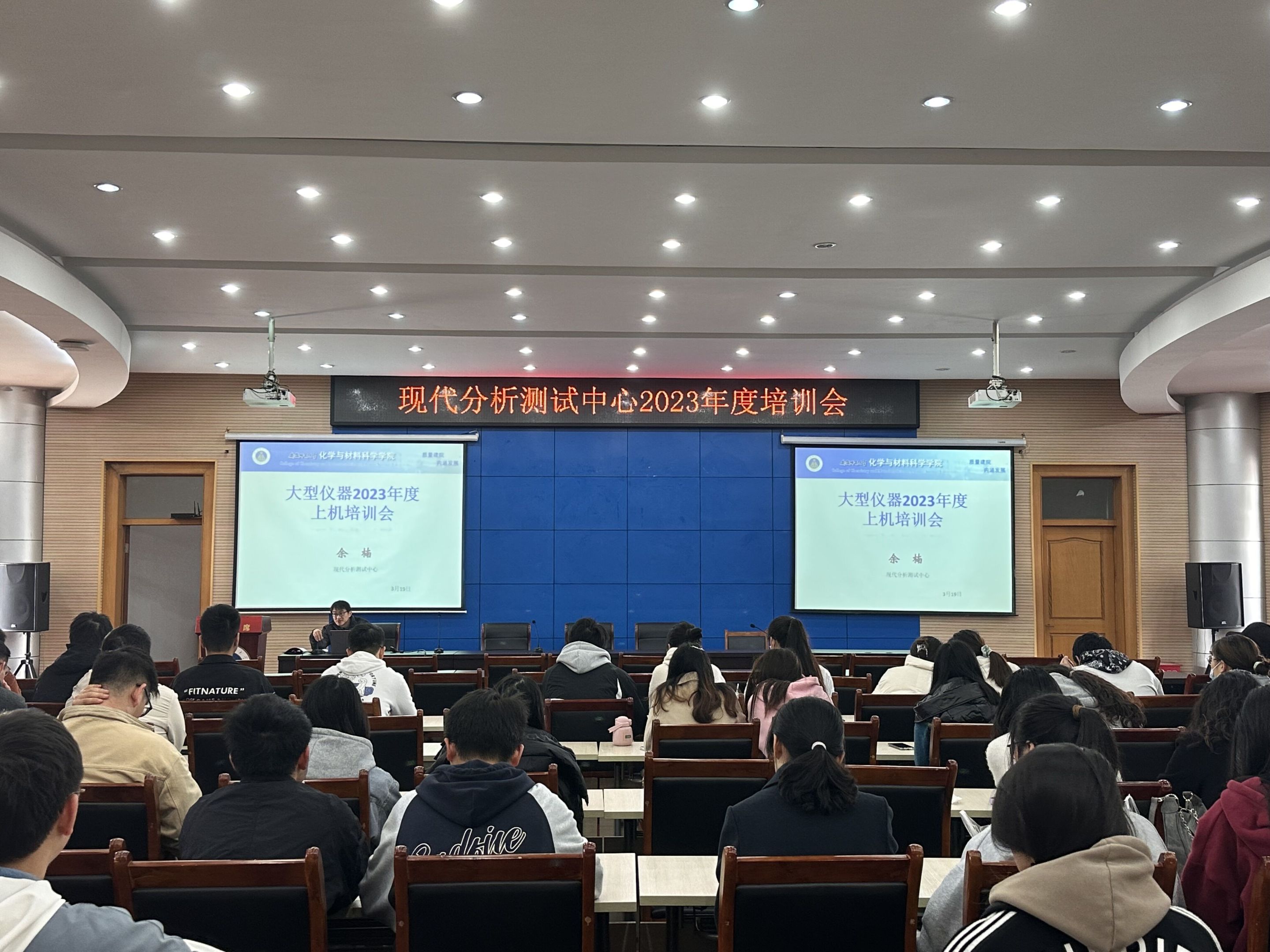 于花津校区会议中心第三报告厅举办现代分析测试中心2023年度大型仪器使用培训会。测试中心全体教师、2022年入职教师以及2022级全体研究生参加此次培训会,会议由测试中心副主任余楠主持。