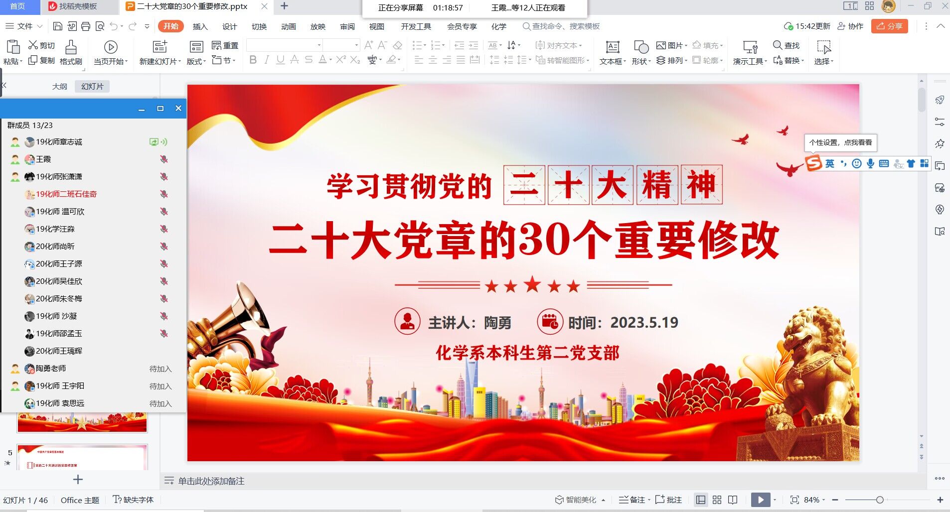 王宇阳、陶勇)为深入开展学习贯彻习近平新时代中国特色社会主义思想主题教育,5月19日下午,化学系本科生第二党支部在9号楼307会议室召开了“三问”交流会,支部全体党员通过线上线下结合的方式参加会议,会议由支部书记陶勇主持。
