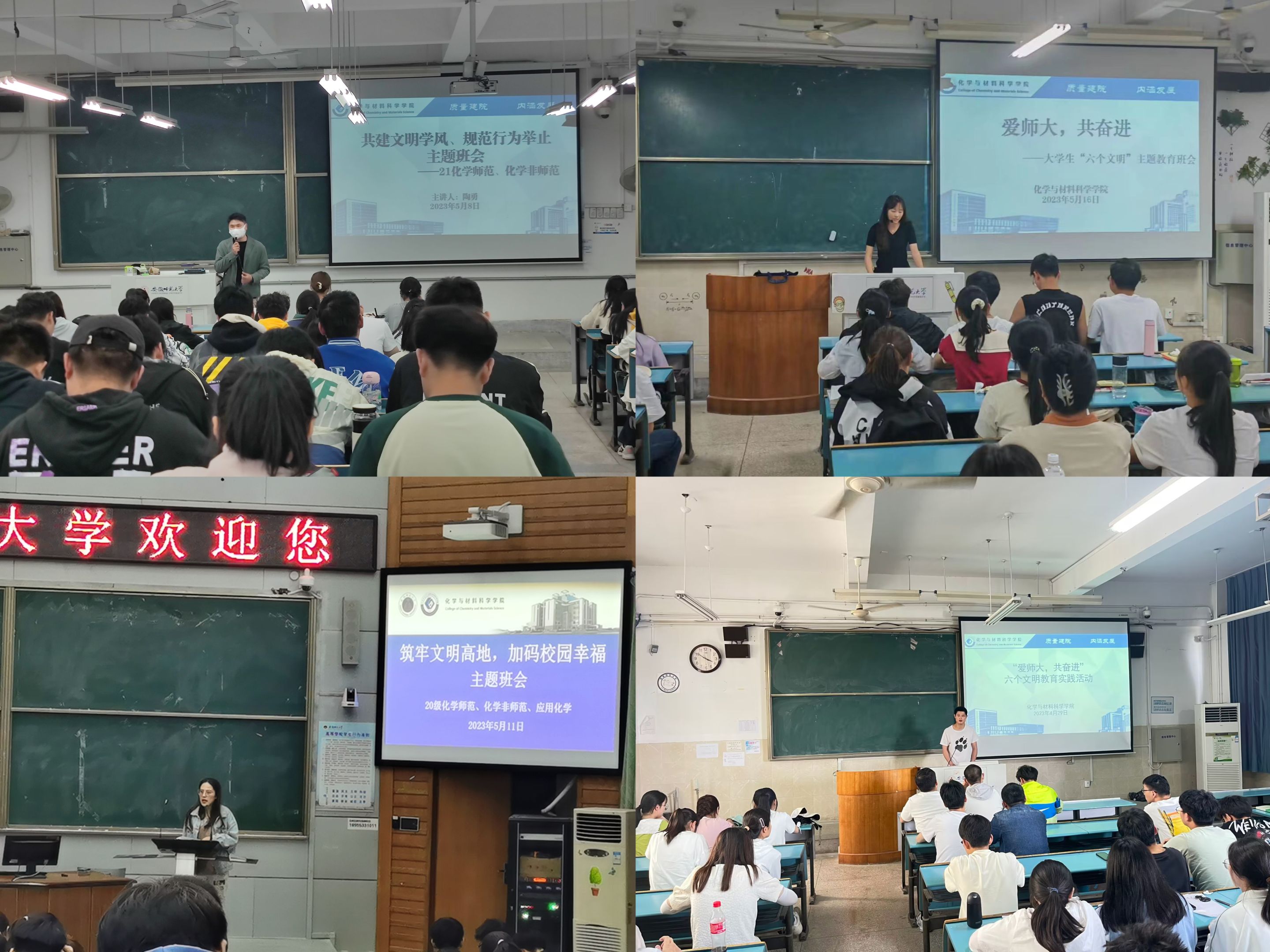 主题班会,规范文明要求。各年级辅导员深入班级召开“六个文明”教育实践活动班会,结合各年级学生实际情况,提出文明修身的具体要求,教育引导学生规范言行,扣好“人生第一粒扣子”,让学生们积极投入校园文明建设之中,做一个有优良品质的文明大学生。