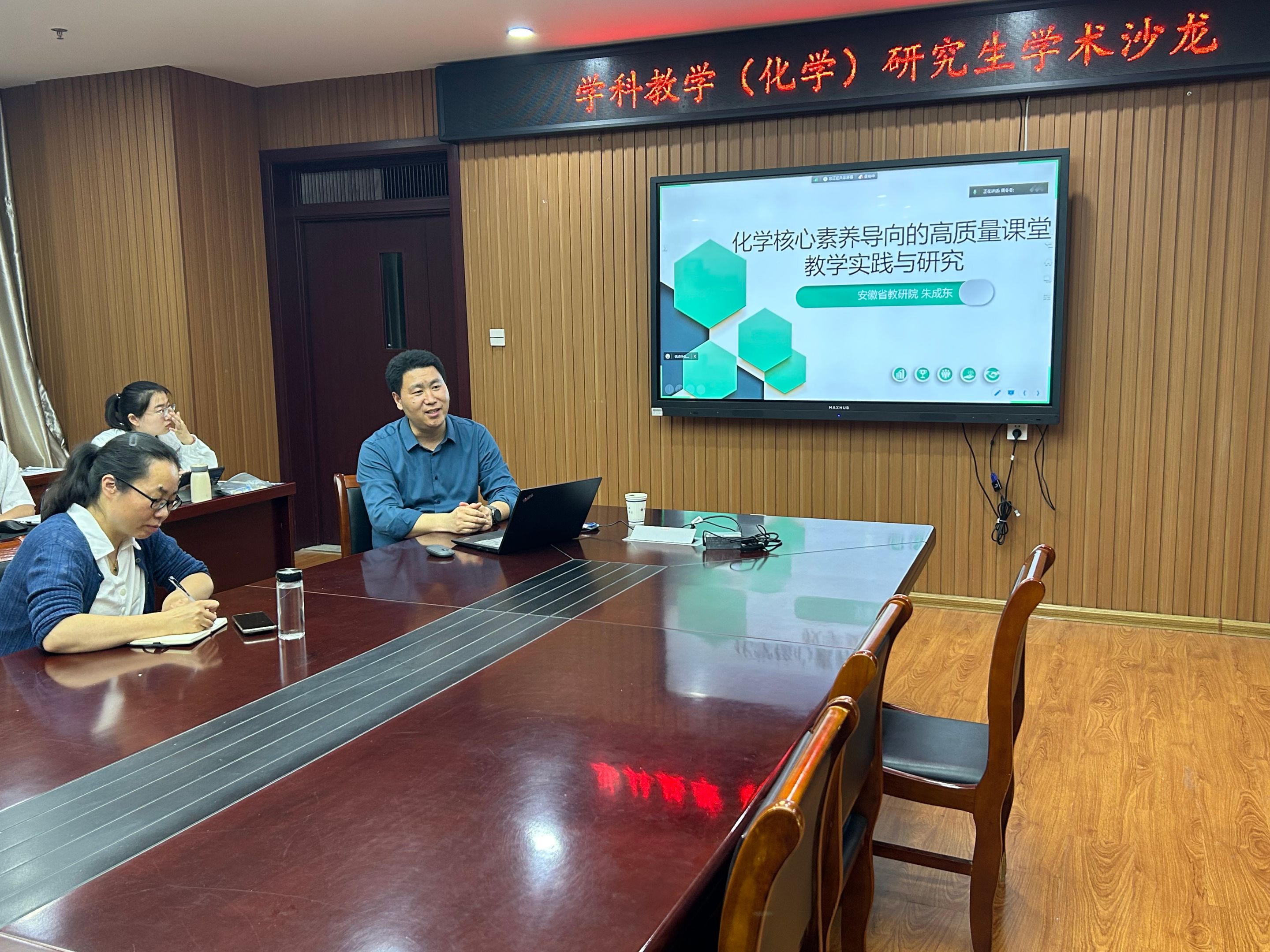 在花津校区礼勤楼702会议室继续主题为“与化学名师面对面,共话新课标新教材新高考”学术沙龙活动。本次活动依然在线上线下同时开展,特邀安徽省教研员朱成东开展主题讲座。活动由孙影教授主持,部分化学教学论教师、全体化学教学论专业研究生参加了此次活动。