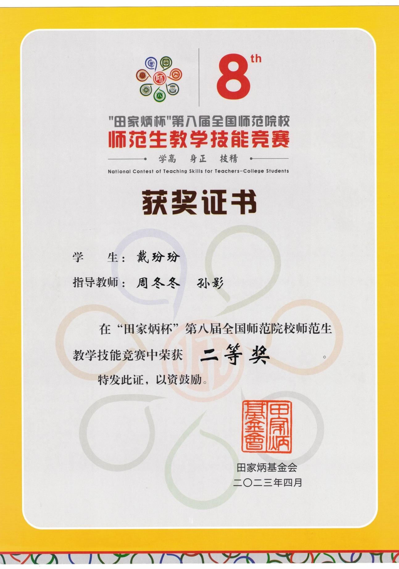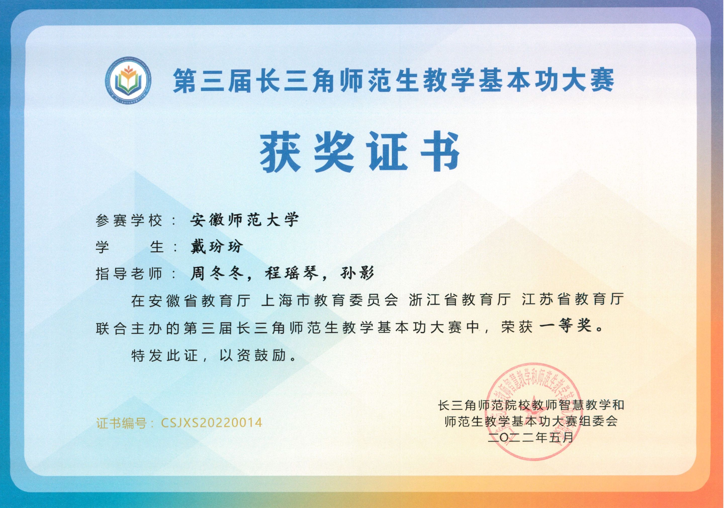 戴玢玢同学秉承着成为优秀化学教师的初心,术业专攻,以行践知,在“田家炳杯”全国师范院校师范生教学技能竞赛中获二等奖,在四省联合举办的长三角师范生教学基本功大赛中获一等奖和二等奖,在安徽省赛中获二等奖,连续两次获51吃瓜网