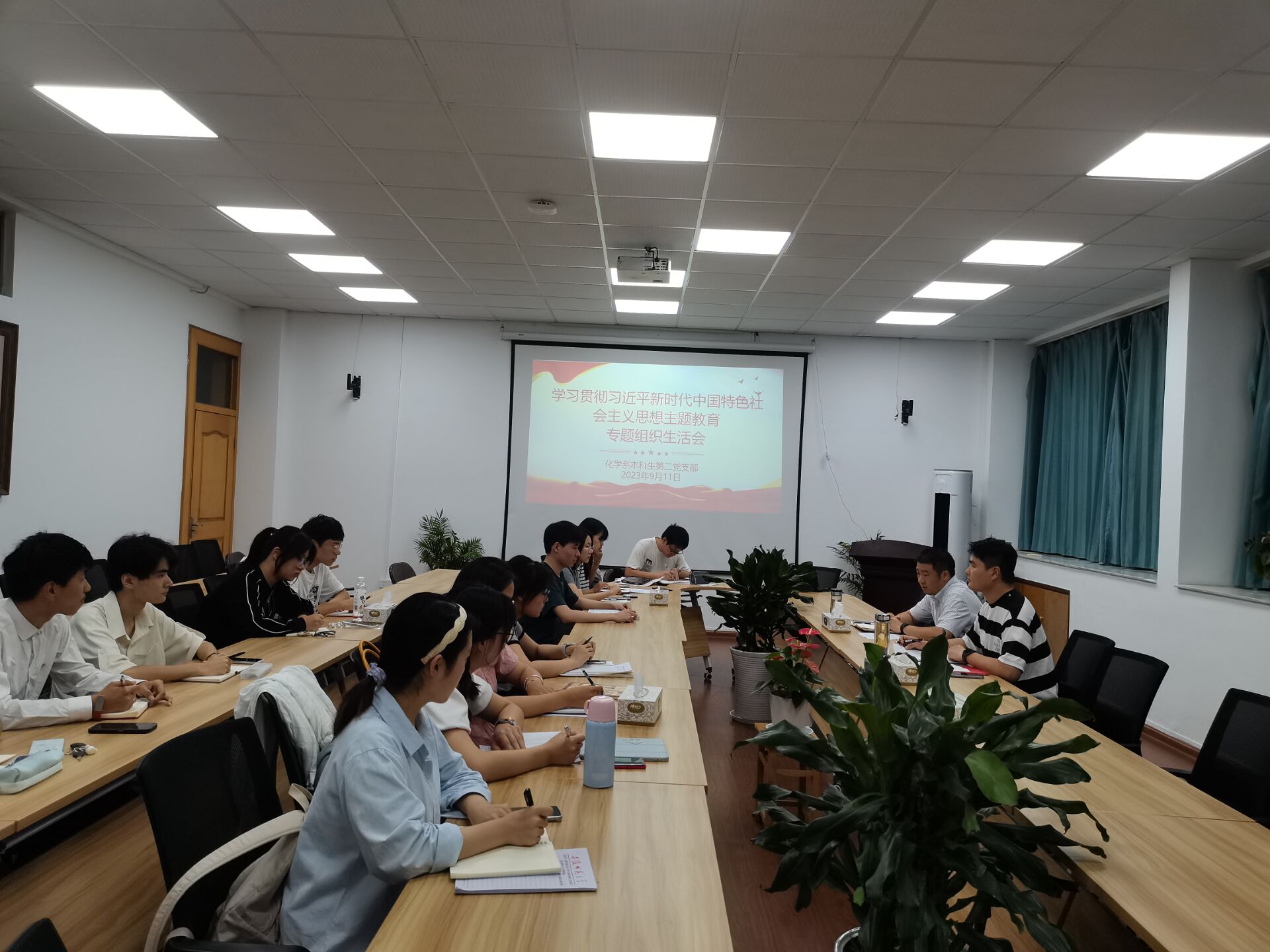 陶勇)按照学校学习贯彻习近平新时代中国特色社会主义思想主题教育领导小组及学院党委总体部署安排,9月11日晚,化学系本科生第二党支部在学苑北楼9号楼205会议室召开学习贯彻习近平新时代中国特色社会主义思想主题教育专题组织生活会,支部全体党员参会,学院党委副书记李古州列席指导,会议由支部书记陶勇主持。