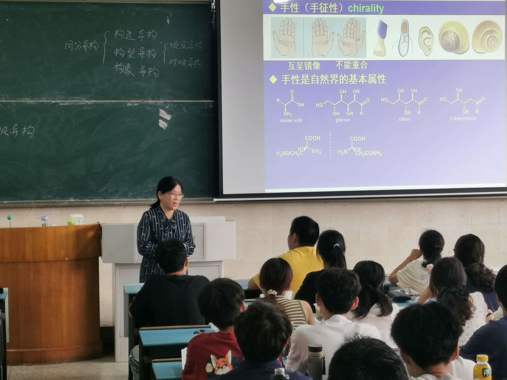 张武教授用深入浅出的讲解、生动形象的描述、清晰严密的逻辑向在座的老师和学生们做了题为《对映异构》的教学示范。张老师首先用生活中常见的实例-景物及其在水中的倒影导入新课-对映异构-互呈镜像,不能重合。然后用图片阐述了手性是自然界的基本属性。在概述分子结构的不对称性及其功能、反应停事件及科研前沿的基础上系统地讲解了手性分子与光的相互作用-旋光性、对映异构现象的发现-史上最美实验和产生原因-不对称碳原子等基本知识。剖析了对映异构现象与分子对称性的关系,得出了分子是否具有手性的判断依据。讲解过程条理清晰,层层推进,借助模型,破解难点。不断设问,引导学习,课堂氛围活跃,学生紧跟教师思路,走进对映异构的天地,感受有机化学的魅力。