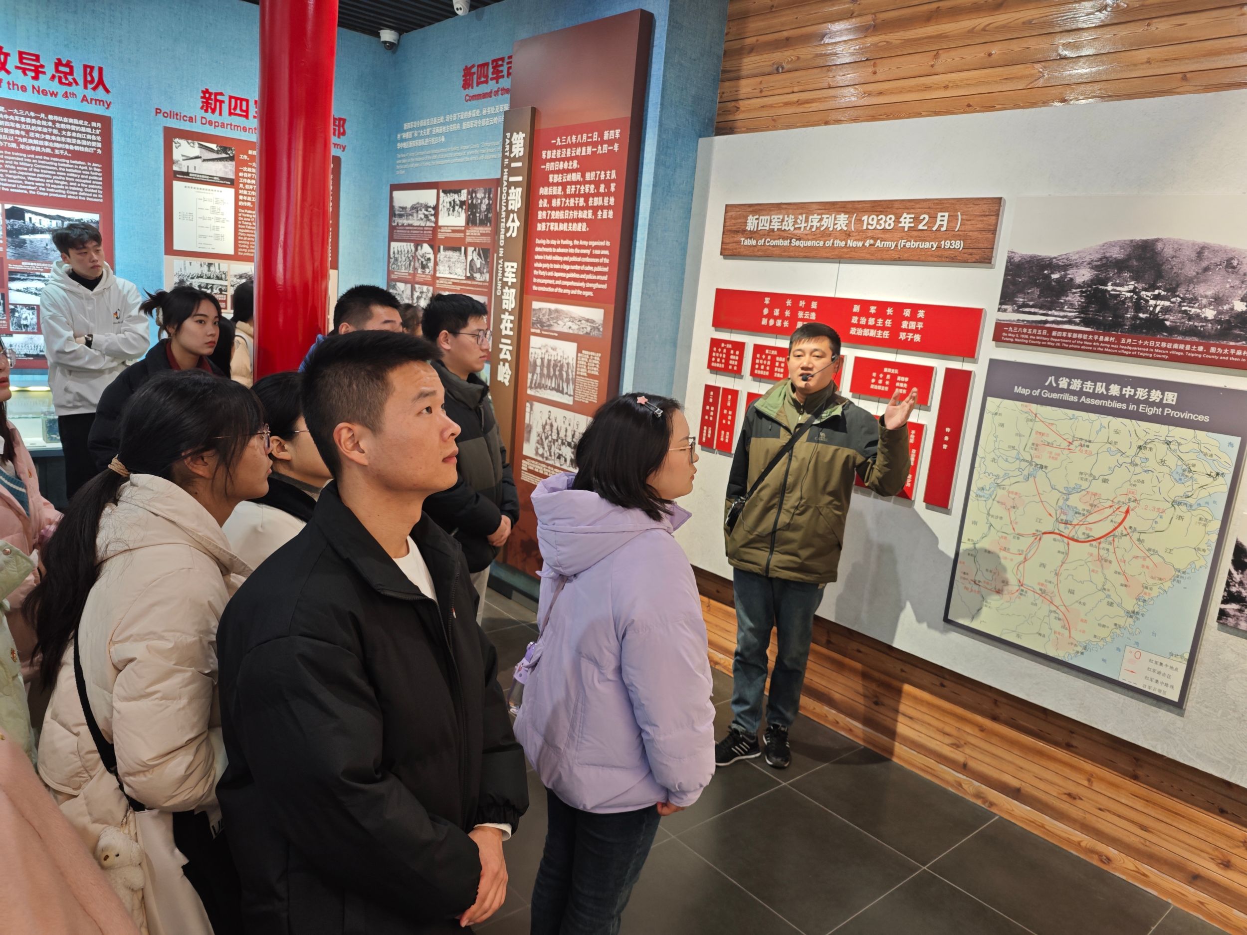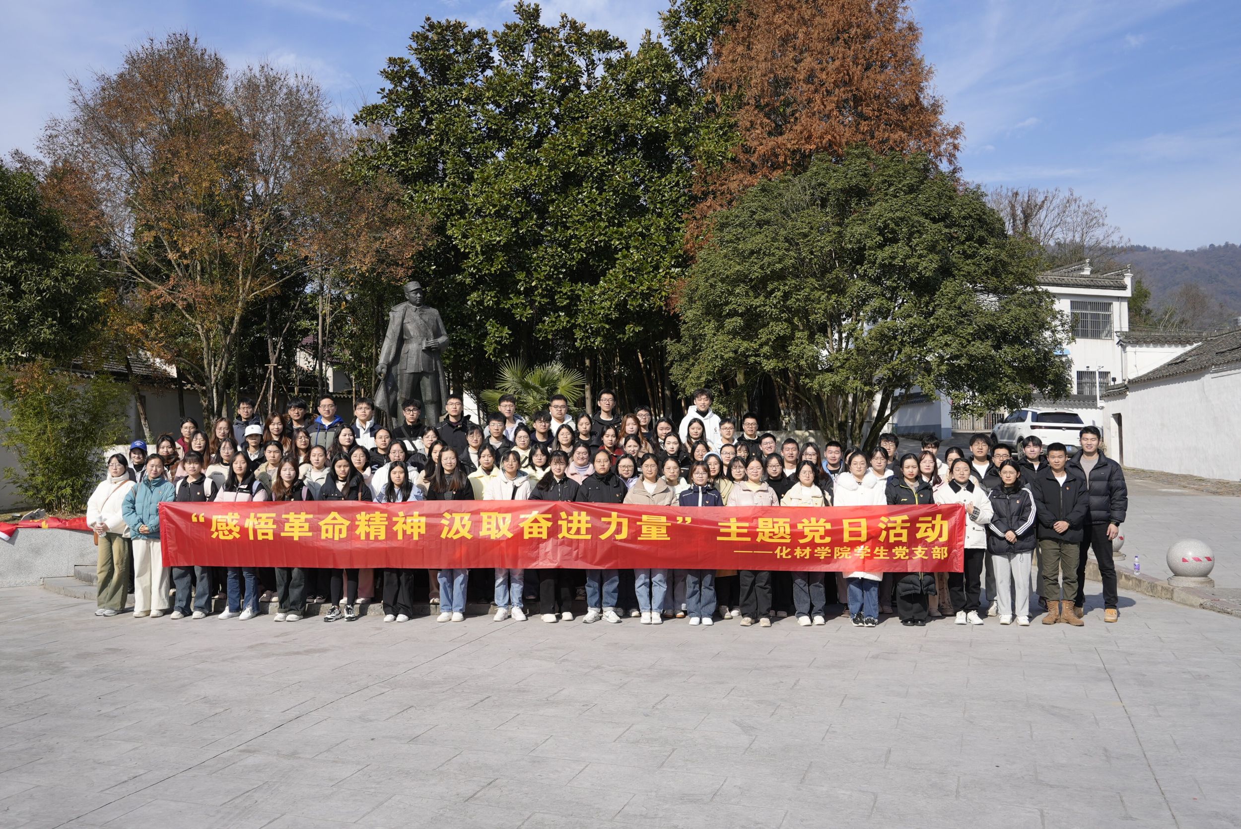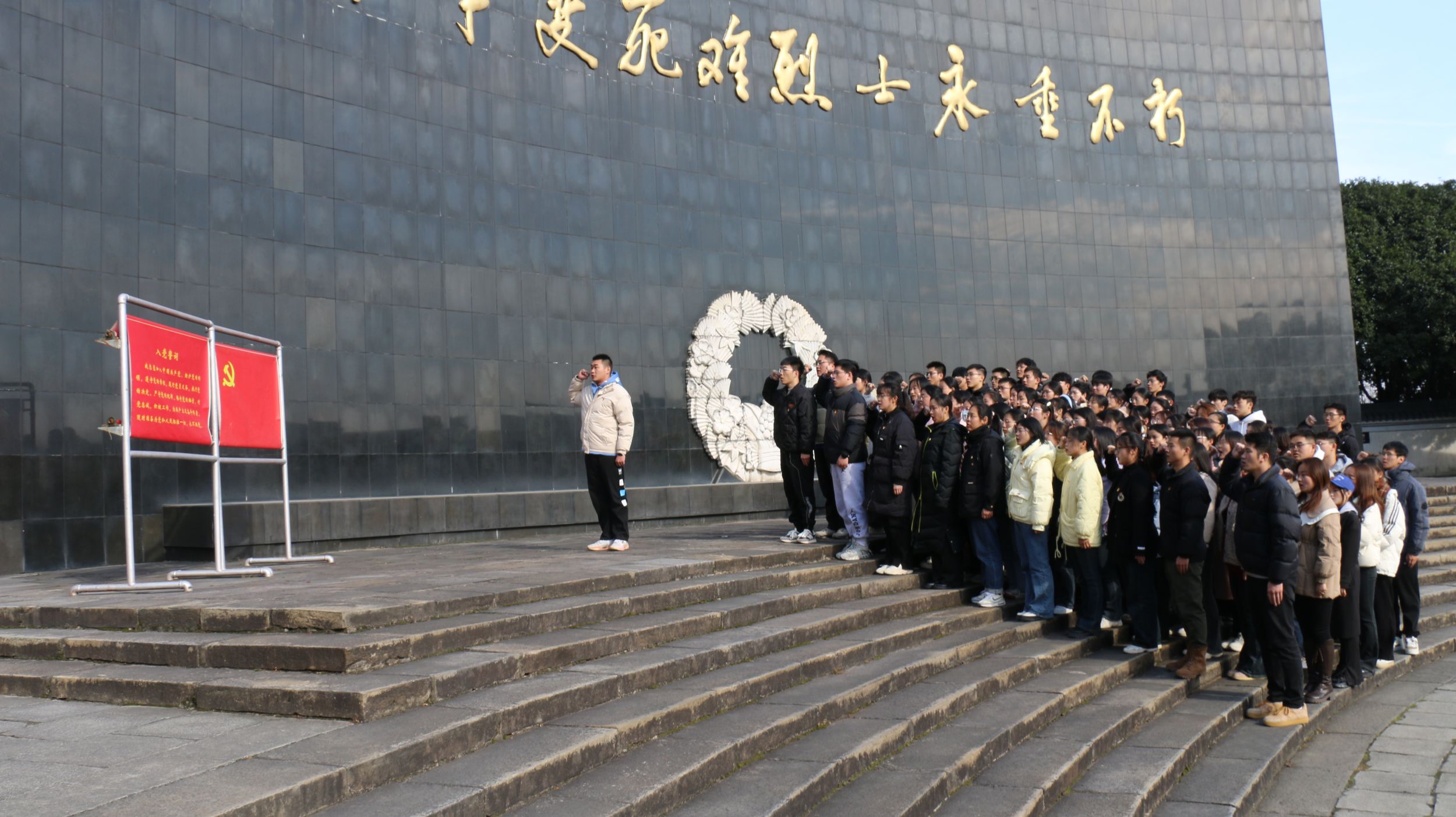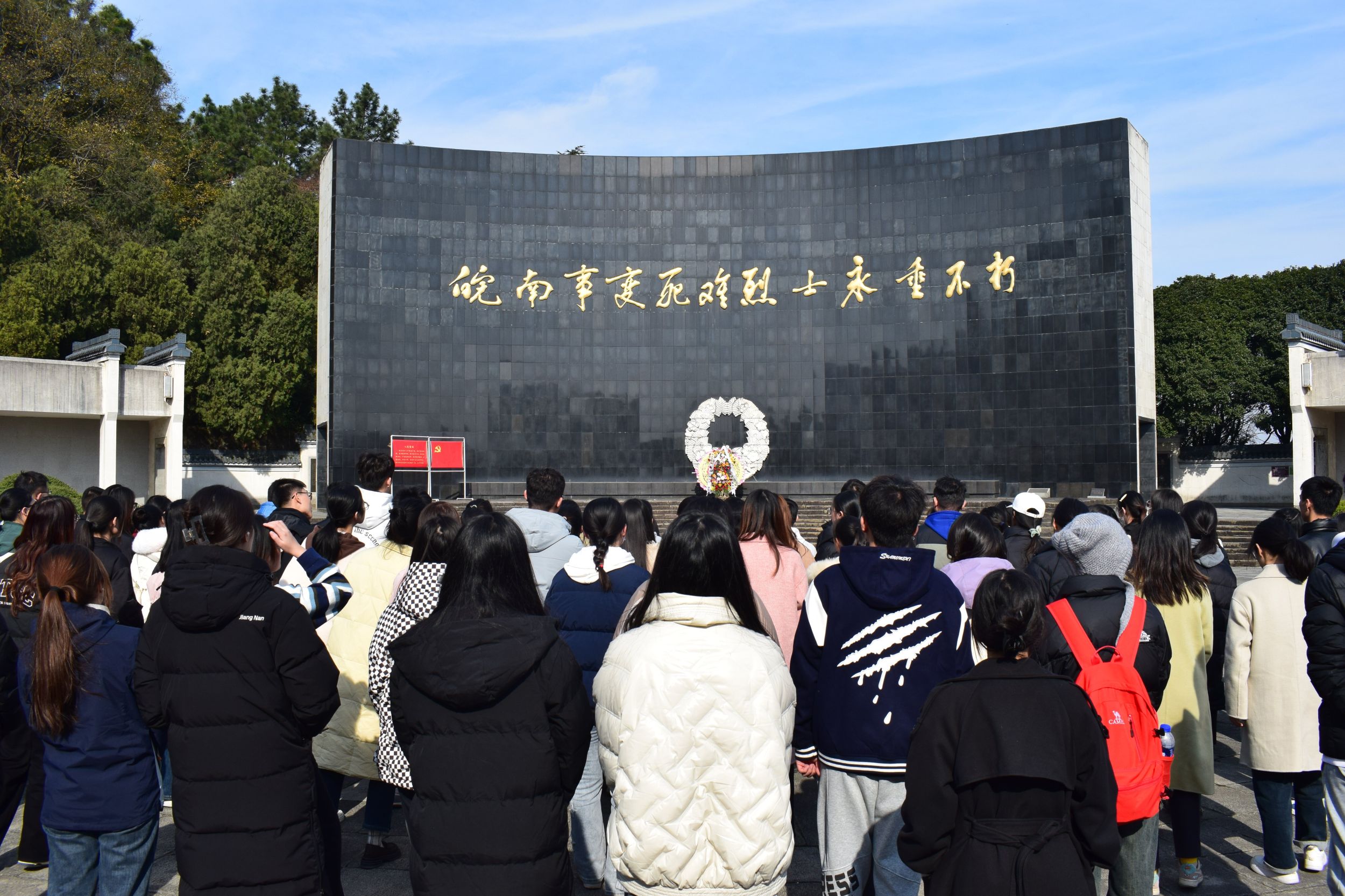实地研学,强化党性锻炼。12月3日,学院组织培训班全体学院和学生党支部书记前往安徽宣城泾县开展实践活动,集体参观了新四军军部旧址和皖南事变烈士陵园,悉心“拜读”了这些记录着中国共产党及其人民军队丰功伟绩的立体史书,深刻感受到新四军在艰苦环境下坚持革命斗争的英雄气概。烈士陵园的每一处建筑都具有象征性的意义,一砖一瓦都有着深刻的寓意同时也寄托着后人对革命先辈的哀思。全体党员同志参观游览了烈士陵园纪念廊和无名烈士墓后,集合在烈士陵园纪念广场中央,进献花圈,鞠躬缅怀。在学生党员陈功洋的引领下,全体党员面对鲜红的党旗庄严宣誓,开展新发展党员集体入党宣誓活动。