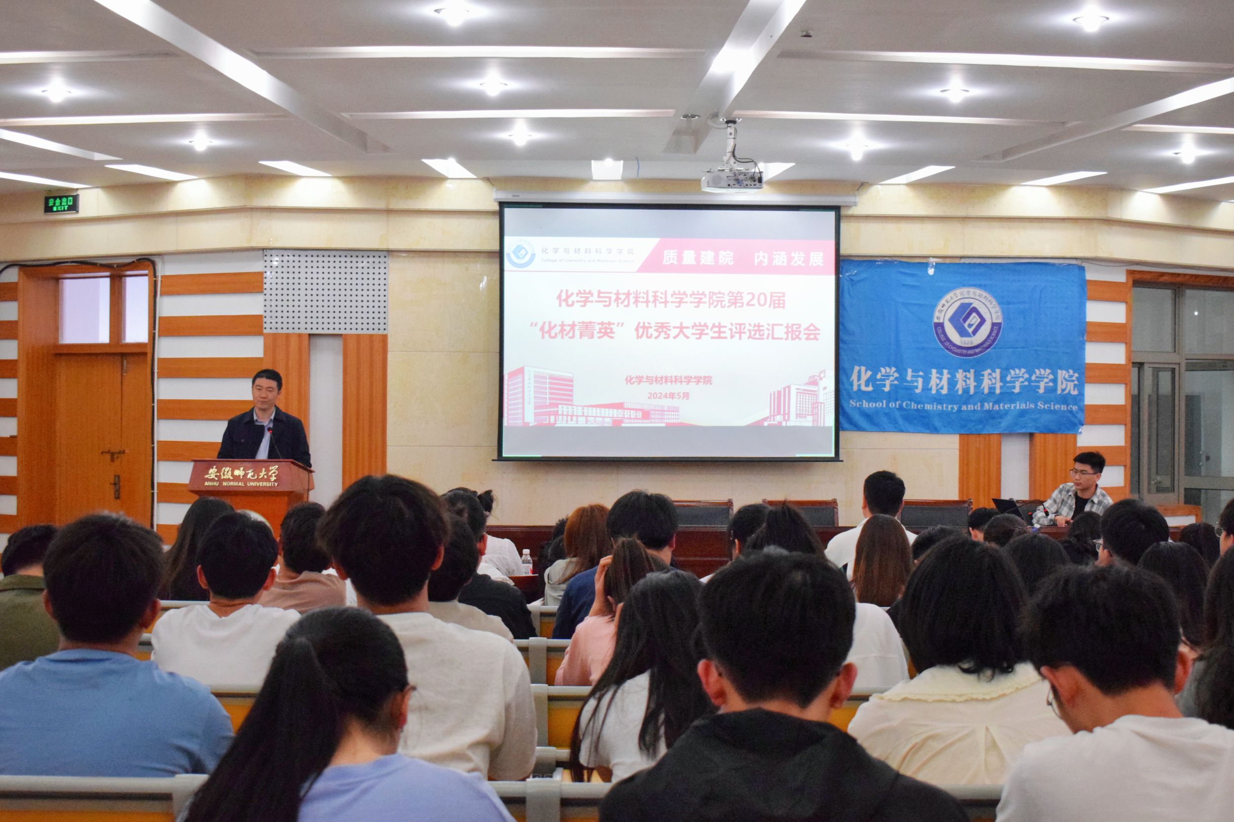 在学苑楼8号楼副楼二楼会议厅举办第二十届“化材菁英”优秀大学生评选汇报会。学院党委副书记李古州、团委书记梅冠东、全体专兼职辅导员、汇报人员和各班级学生代表参加此次大会,会议由2023级化学师范专业汪梦雅同学主持。