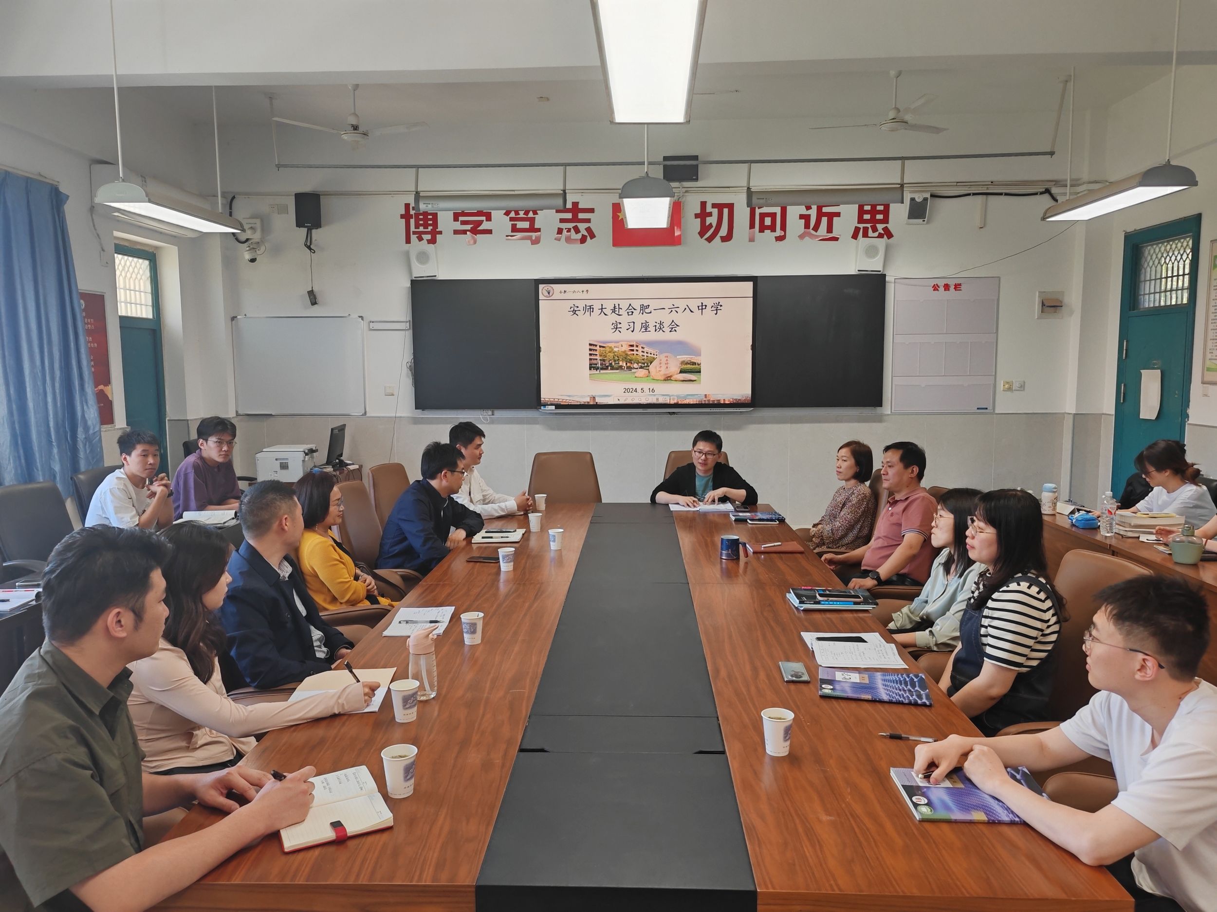 在合肥168中,学慰问实习生,深入实习生临时办公室,详细检查备课情况,开展随堂听课,有针对性的提供教学指导方案。座谈会上,学校年级化学组负责人介绍了学校发展历程、教育教学管理、人才需求以及实习生在校生活实习情况。实习生逐一发言,畅谈实习心得和收获。方臻对合肥168中学的大力支持表示感谢,并希望同学们珍惜实习机会,不断提升教育教学技能,展现师大学子的风采。会上双方就深化人才培育合作、新高考招生政策等进行了深入交流。